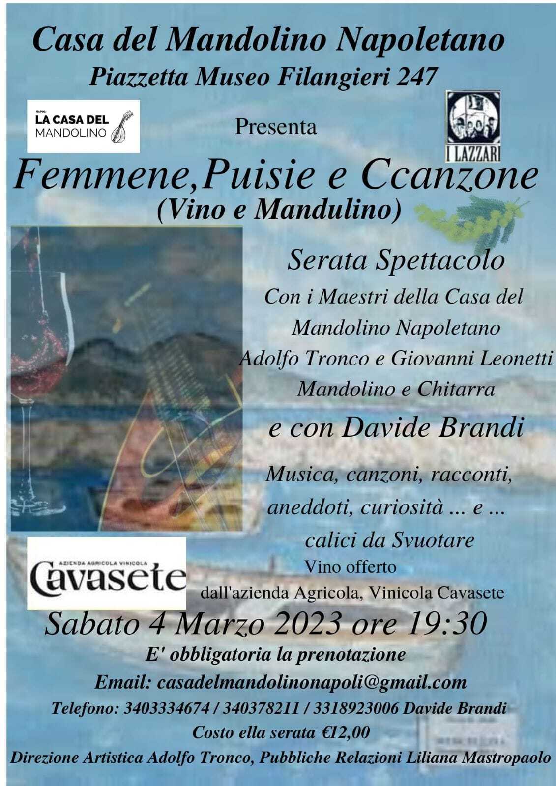 Torna attesissimo l' appuntamento con lo spettacolo coorganizzato dalla Casa del Mandolino napoletano e dall'Associazione I Lazzari in piazzetta Museo Filangieri 247 a Napoli e, con musiche della tradizione classica napoletana, eseguite dai Maestri della Casa del Mandolino, Maestri Adolfo Tronco e Giovanni Leonetti , degustando qualche calice di vino offerto dall'Azienda Agricola Vinicola Cavasete, di Giuseppe Luongo , ascoltando Davide Brandi ('O Prufessore 'e lengua napulitana che sentiamo anche a Radio Marte), con una serata dedicata alle Femmene... Festeggeremo la Donna esaltandone le “divinità” accompagnati dal suono dei mandolini "Ebbiva e Femmene".