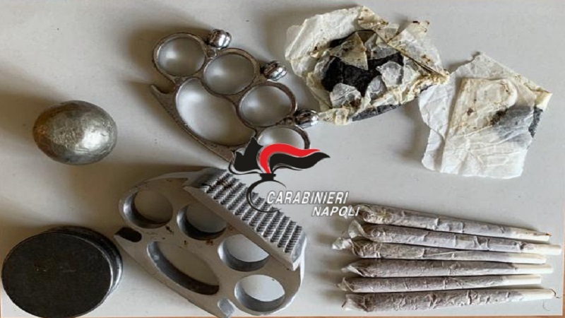 Perquisito, è stato trovato in possesso di 20 grammi di hashish, di 6 spinelli e anche di 2 tirapugni e di una sfera in metallo di 250 grammi.