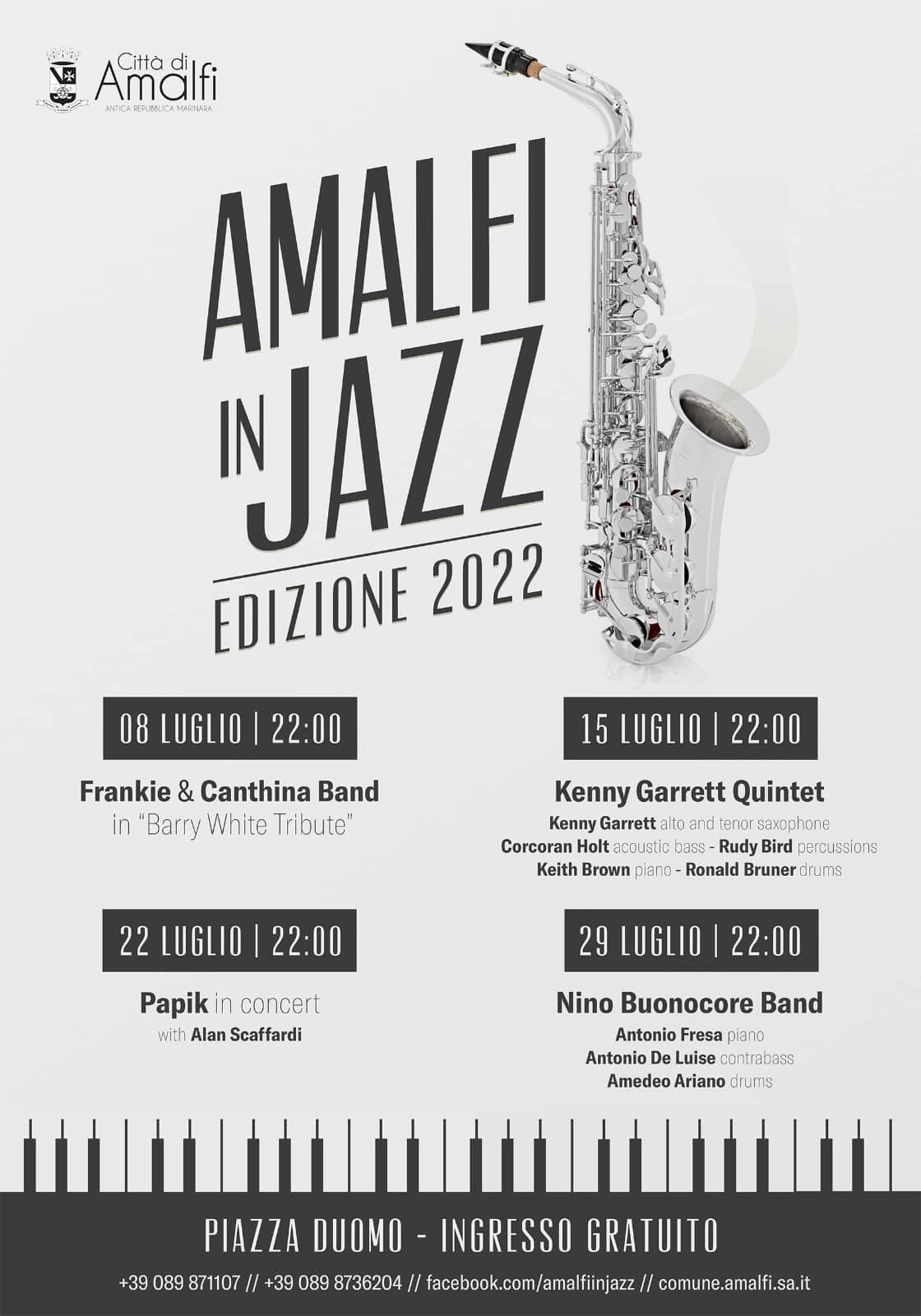 Sarà proprio la rassegna Amalfi in Jazz ad aprire la stagione degli eventi, venerdì 8 Luglio (h. 22 in Piazza Duomo). Protagonista Frankie & Canthina Band in “Barry White Tribute”. Band storica capitanata da Frankie Lo Vecchio, che propone un repertorio internazionale Soul/Funky/Dance/ 70/80, tra ritmi trascinanti e con un'orchestra di 15 elementi, per rendere omaggio al Re della black music.