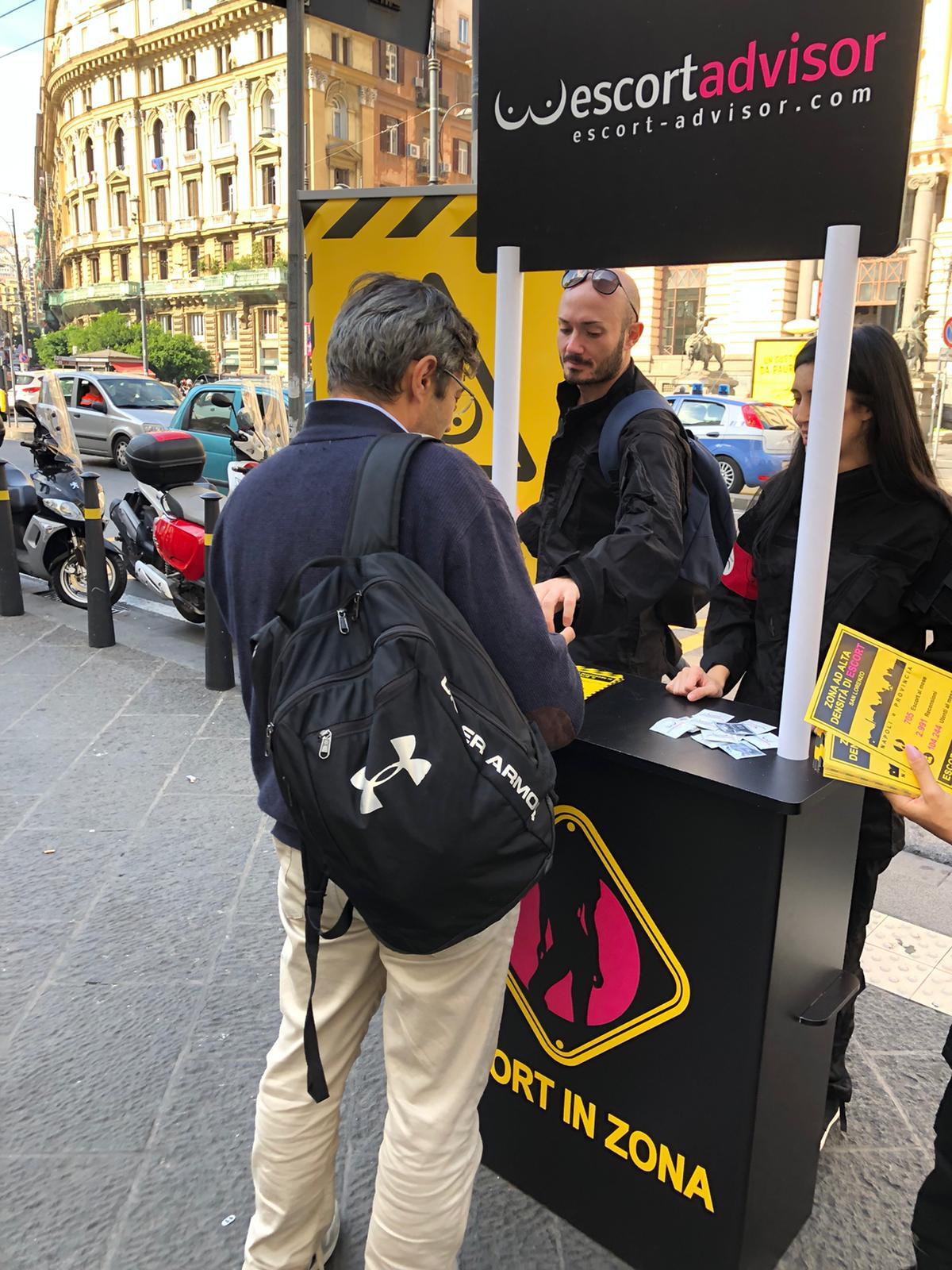 “Attenzione zona ad alta densità di escort”, questo è il claim della campagna abbinato a banchetti con tanto di roll up informativi sulla situazione della zone quando si parla di presenza di escort attive e che lavorano in maniera redditizia. Ragazze e ragazzi in divisa militare con tanto di fascia al braccio con lo stemma di Escort Advisor, distribuiscono informative e preservativi ai passanti per far sì che si “difendano” dalle sex workers che “infestano” nella città di Napoli il quartiere San Lorenzo.