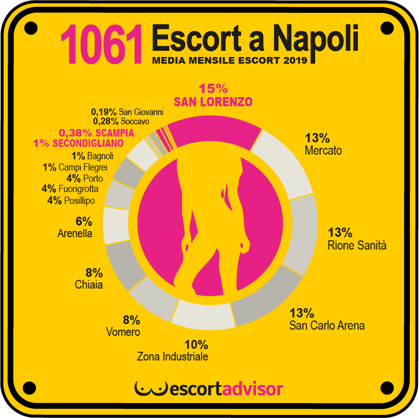 Volendo disegnare una mappa con le zone e la presenza di escort, Napoli risulta così divisa: San Lorenzo 159 escort attive (15%), Mercato 135 (13%), Rione Sanità 133 (13%), San Carlo Arena 133 (13%), Zona Industriale 107 (10%), Vomero 86 (8%), Chiaia 84 (8%), Arenella 63 (6%), Posillipo 42 (4%), Fuorigrotta 41 (4%), Porto 41 (4%), Campi Flegrei 11 (1%), Bagnoli 10 (1%), Secondigliano 7 (1%), Scampia 4 (0,38%), Soccavo 3 (0,28%), San Giovanni (a Teduccio) 2 (0,19%).