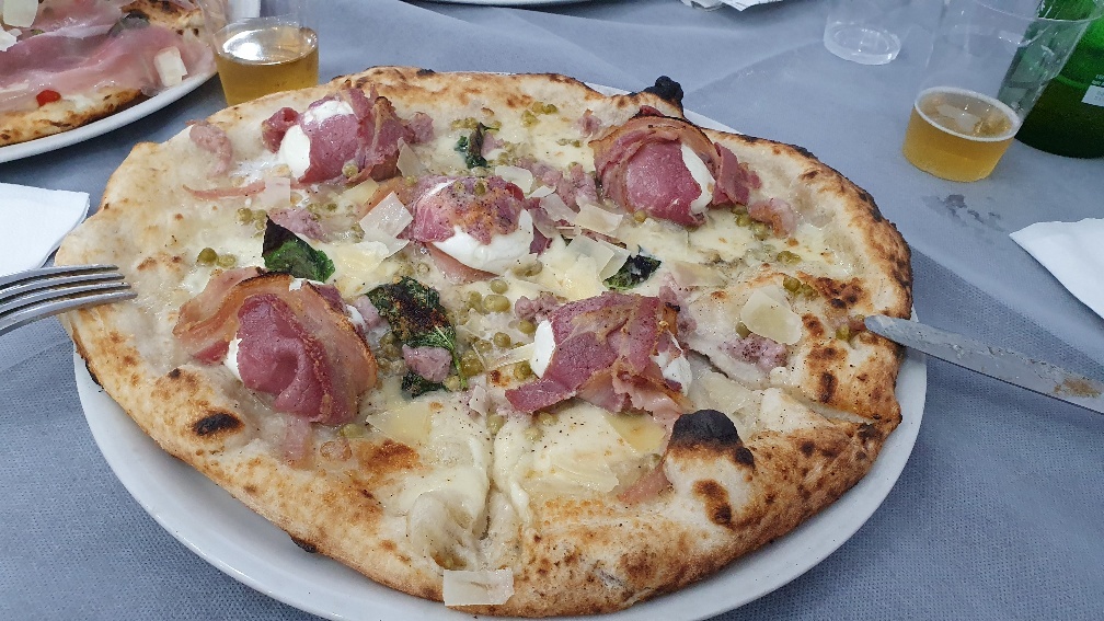In foto: Fantasie a colori di "Gennaro" con Prosciutto di Parma, scaglie di Parmigiano Reggiano, Mozzarella di Bufala DOP, Pancetta affumicata, rucola e straccetti di salsiccia. Cornicione ripieno a scomparto con peperoni, melenzane, zucchine e friarielli. Il tutto condito con olio extra vergine di oliva italiano.