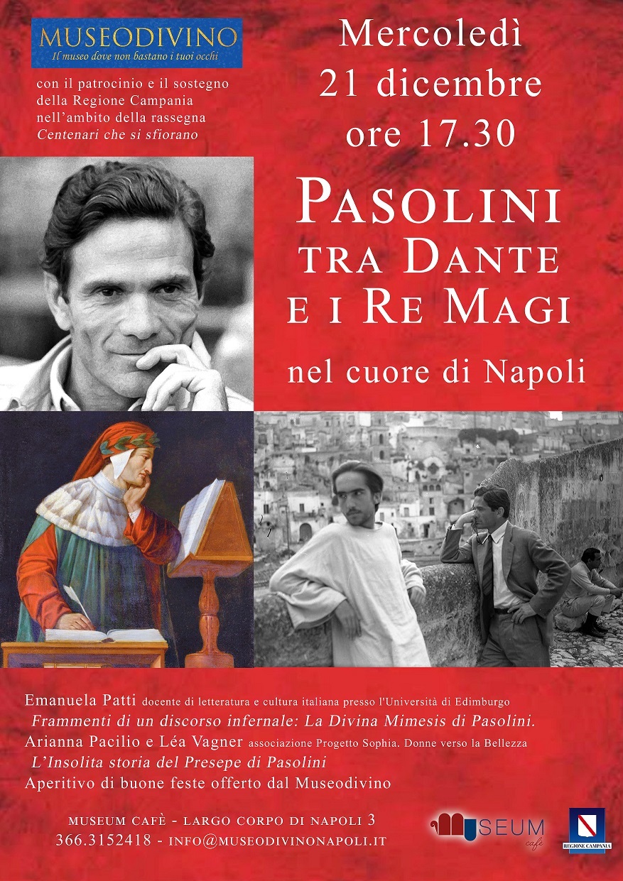 Una festa dell’intelletto e del cuore per contemplare gli aspetti più lucidi e luminosi dell’opera di Pasolini, con proiezioni, parole e un aperitivo conclusivo di saluto: sul finire dell’anno dedicato alla memoria di Pasolini, ancora nell’eco delle celebrazioni dantesche e all’avvicinarsi del Natale, mercoledì 21 dicembre alle 17.30 nella calorosa cornice di Museum Café presso Largo Corpo di Napoli Museodivino organizza Pasolini tra Dante e i Re Magi. L’incontro, realizzato nell’ambito della rassegna “Centenari che si sfiorano” con il patrocinio e il sostegno di Regione Campania, si svolge all’insegna di due opere pasoliniane ispirate alla Divina Commedia e alla vita di Cristo: la Divina Mimesis e Il Vangelo secondo Matteo.