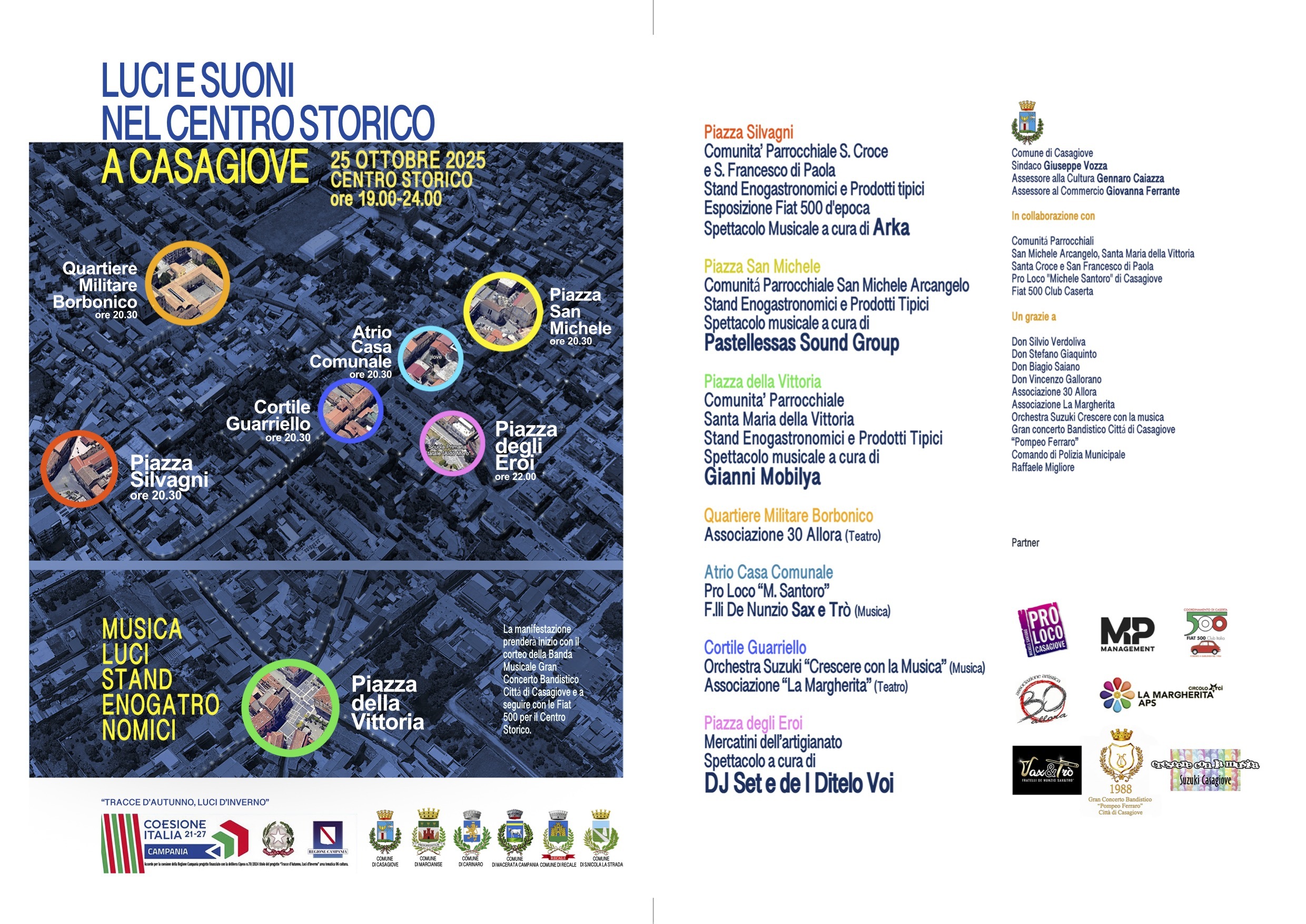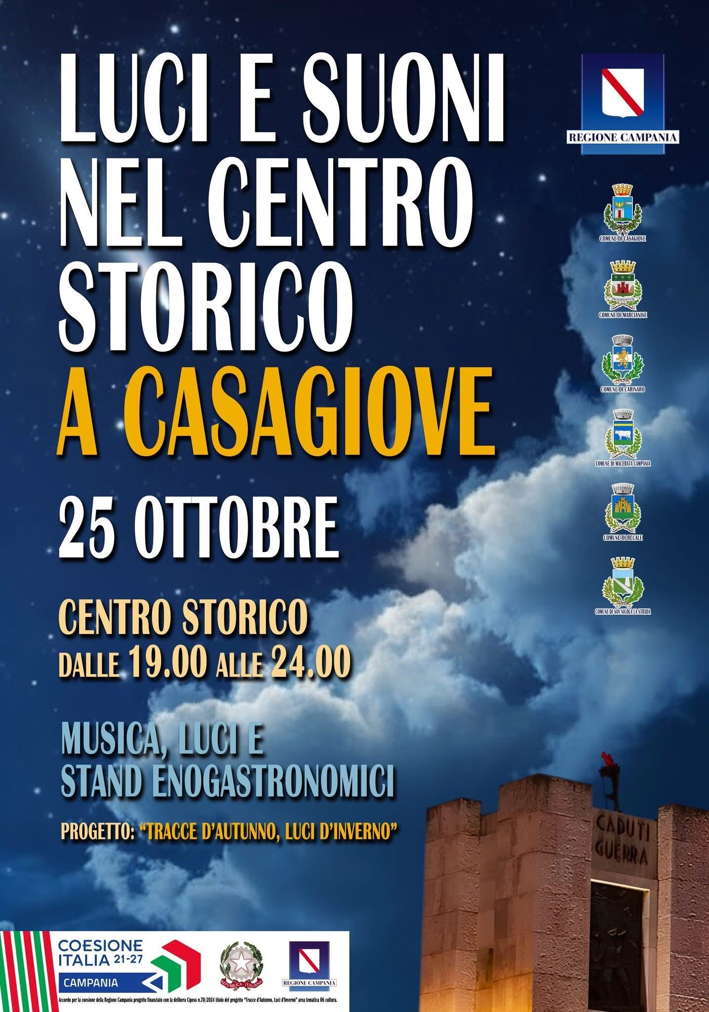 La Notte Bianca di Casagiove “Luci e Suoni nel Centro Storico”, promossa dal Comune di Casagiove, rientra nell’ambito del progetto “Tracce d’Autunno, Luci d’Inverno” – finanziato dalla Regione Campania attraverso l’Accordo per la Coesione (Delibera CIPESS n. 70/2024) – realizzato attraverso la partecipazione congiunta dei Comuni di Carinaro, Casagiove, Macerata Campania, Marcianise (capofila), Recale e San Nicola la Strada.
