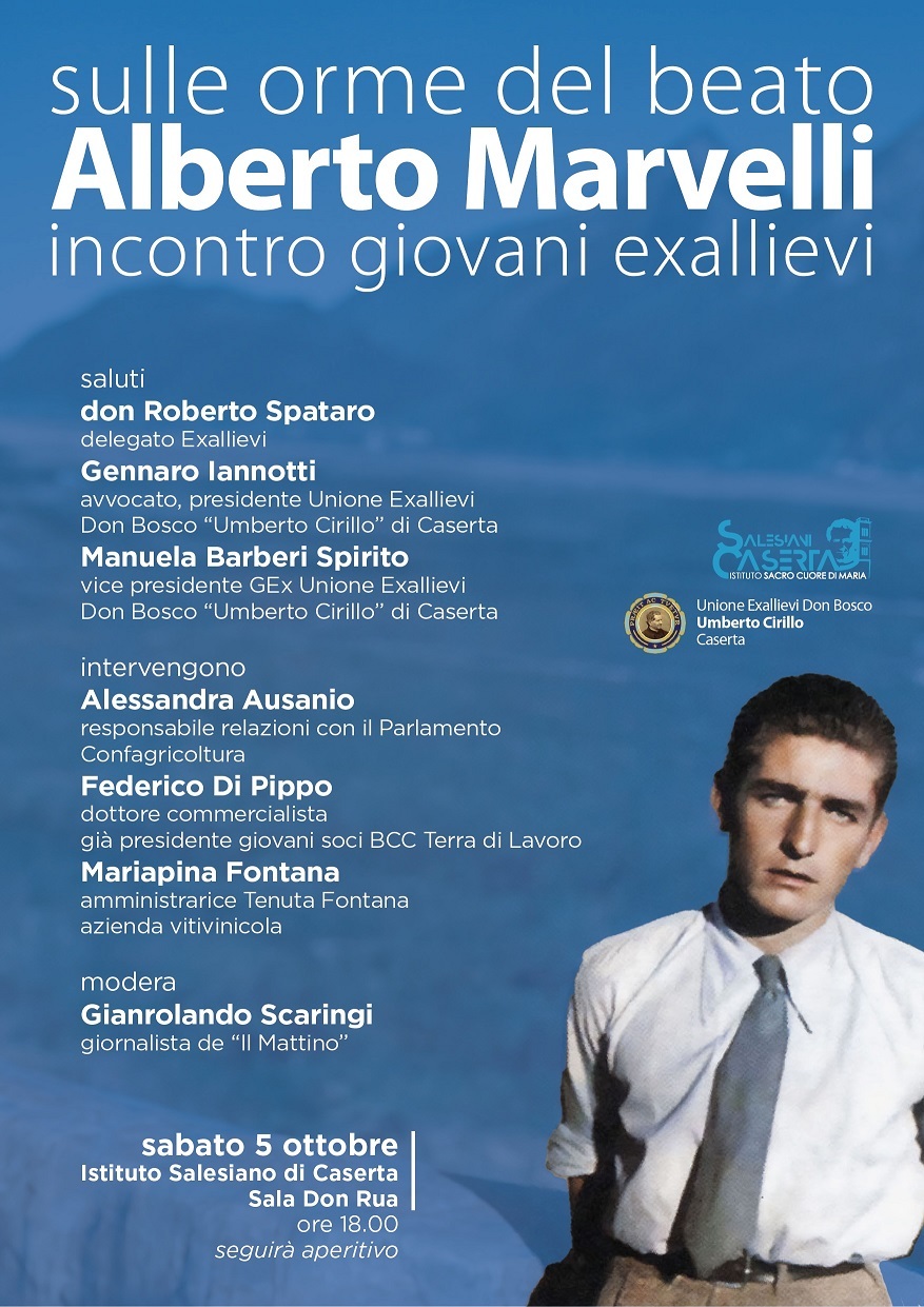 Domani pomeriggio, alle 18.00 presso l’Istituto Salesiano di Caserta, l’Unione Exallievi Don Bosco “Umberto Cirillo” promuove l’incontro “Sulle orme del beato Alberto Marvelli, incontro giovani exallievi” destinato a favorire il confronto tra gli studenti appena diplomati del liceo e gli studenti dell’ultimo anno con exallievi giovani che siano rappresentanti di un successo formativo e professionale tale da essere fonte di ispirazione per la prossima generazione.