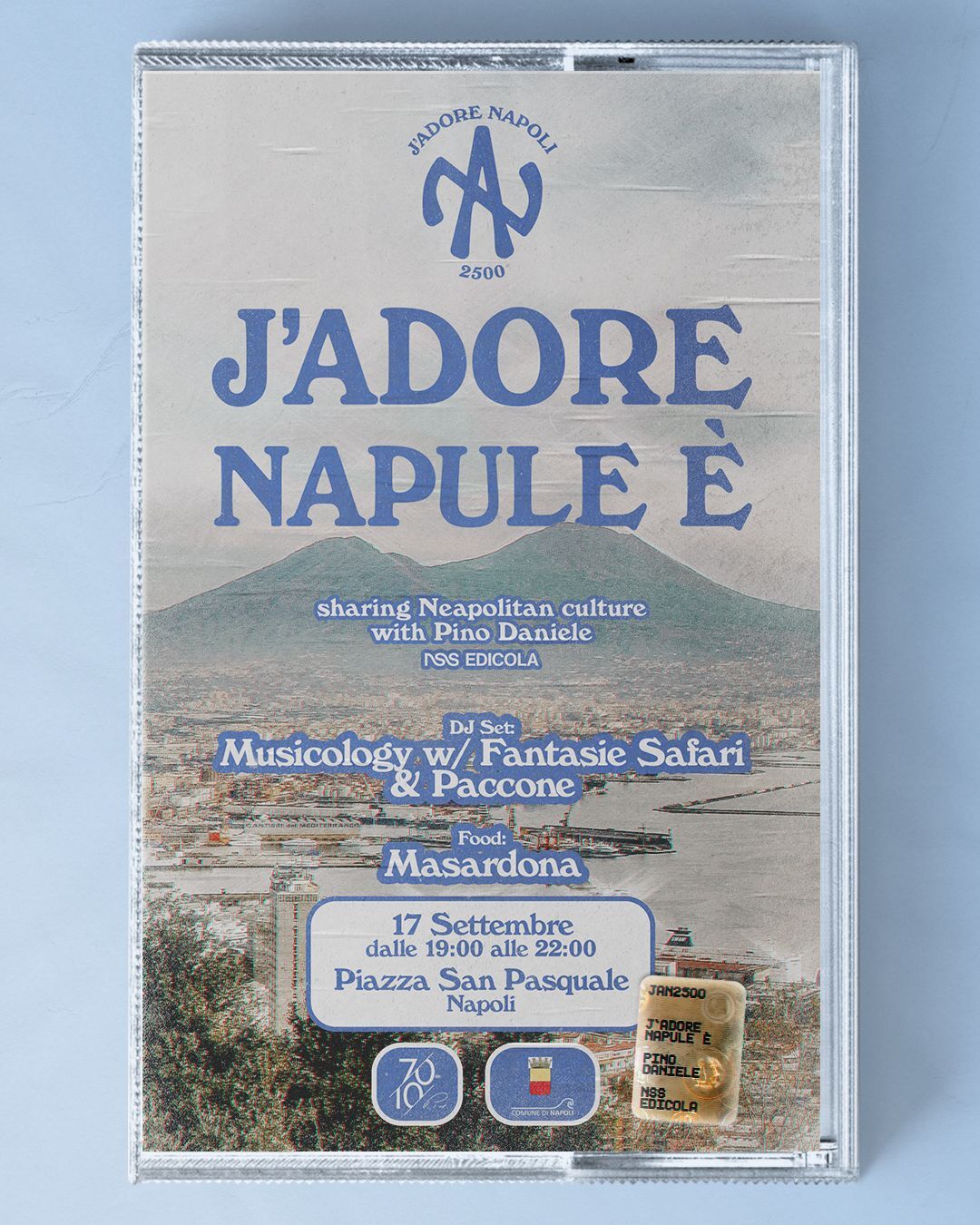 Il progetto J’Adore Napoli 2500 si arricchisce inoltre di una serie di attivazioni diffuse in luoghi e simboli iconici della città: la storica pizzeria Masardona di Piazza Vittoria ospiterà vetrofanie speciali ispirate a Pino Daniele, trasformando le vetrine in un omaggio visivo alla sua eredità musicale; la storica bottega artigiana Ferrigno a San Gregorio Armeno realizzerà statuette personalizzate raffiguranti Daniele con la t-shirt “J’Adore Napule è”, in un incontro unico tra tradizione artigiana e cultura pop contemporanea, ed infine il Caffè Sansone a Corso Vittorio Emanuele parteciperà all’iniziativa con nuove tazzine dedicate, rafforzando il legame tra gli spazi della quotidianità e la memoria culturale condivisa. Fra le attività anche uno shooting che ha visto protagonista la giovane cantautrice Florinda, come tanti suoi coetanei fortemente ispirata dalla musica di Pino.