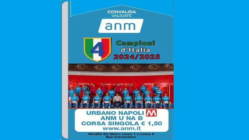 In occasione del 4° scudetto vinto dalla squadra partenopea, ANM ha progettato un biglietto celebrativo dell’evento. L’Azienda è orgogliosa di comunicare che, grazie alla collaborazione con la Società Sportiva Calcio Napoli che ne ha concesso l’utilizzo, il biglietto riporterà la foto ufficiale della squadra scattata nella splendida cornice della stazione “Chiaia” di linea 6.