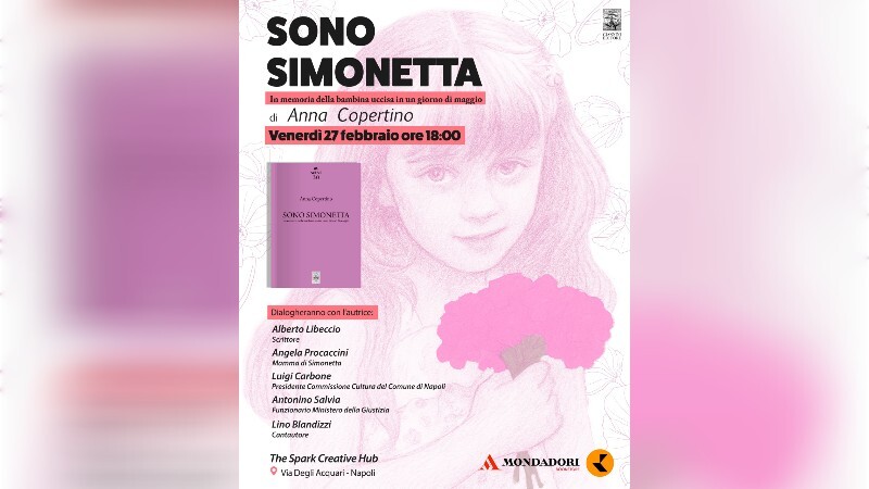 Restituire un volto e una voce a chi è stata vittima della barbaria criminale a soli 11 anni, è questo l'obiettivo del libro “Sono Simonetta” di Anna Copertino. L’opera è pubblicata dalla Giannini Editore nella collana Sorsi. L’autrice terrà la prossima presentazione venerdì 27 febbraio alle ore 18 presso la libreria The Spark Creative Hub, via Degli Acquari, Napoli. Dialogheranno con l’autrice: lo scrittore Alberto Libeccio, la mamma di Simonetta Angela Procaccini, il presidente Commissione Cultura del Comune di Napoli Luigi Carbone, il funzionario del Ministero di Giustizia Antonino Salvia e il cantautore Lino Blandizzi.