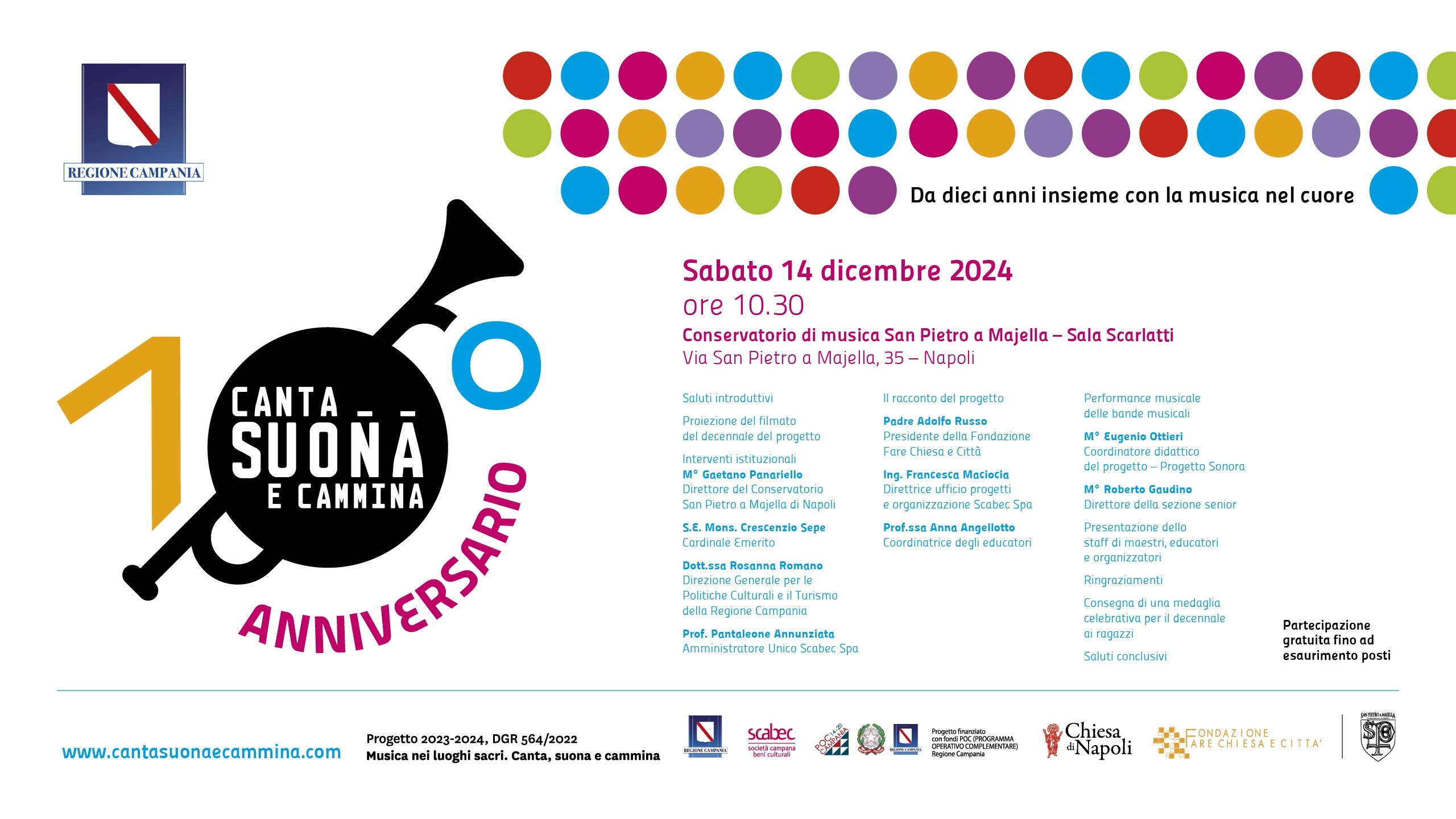 Nella Sala Scarlatti del Conservatorio, ai saluti istituzionali del M° Gaetano Panariello, Direttore del Conservatorio San Pietro a Majella di Napoli, di S.E. Mons. Crescenzio Sepe, Cardinale Emerito, di Rosanna Romano, Direzione Generale per le Politiche Culturali e il Turismo della Regione Campania, e di Pantaleone Annunziata, Amministratore Unico Scabec Spa, seguiranno gli interventi di Padre Adolfo Russo, Presidente della Fondazione Fare Chiesa e Città, Francesca Maciocia, Direttrice ufficio progetti e organizzazione Scabec Spa, Anna Angellotto, Coordinatrice degli educatori, a cui è affidata la narrazione dei dieci anni del progetto. Infine, prevista una performance delle bande musicali con la direzione dei maestri Eugenio Ottieri, Coordinatore didattico del progetto – Progetto Sonora, e Roberto Gaudino, Direttore della sezione senior.