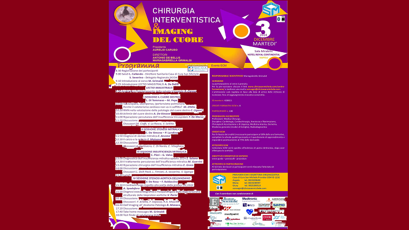 Si terrà martedì 3 dicembre a Napoli presso la Sala Mirabilis dell'Hotel Royal Continental il convegno "Chirurgia interventistica e imaging del cuore" a cura della Clinica San Michele di Maddaloni. Apertura dei lavori alle ore 9.00.