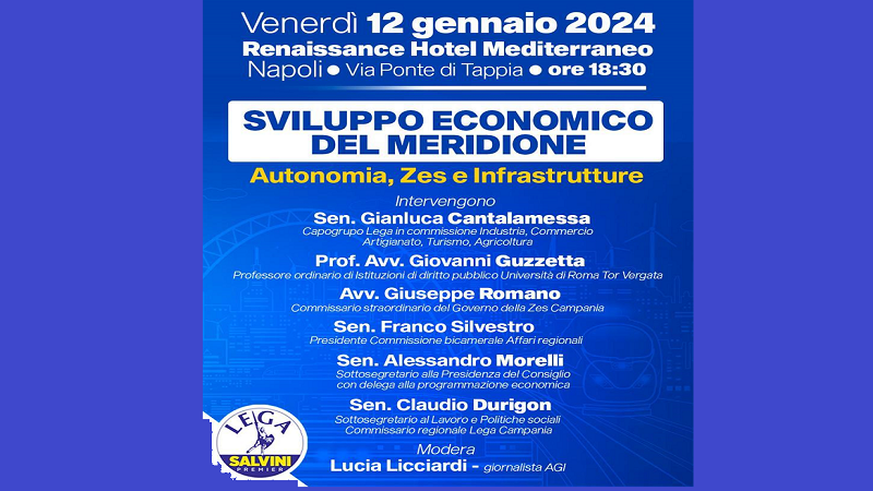 Interverranno il Sen.Gianluca Cantalamessa, Capogruppo Lega in Commissione Industria, Commercio, Artigianato, Turismo e Agricoltura; Prof.Avv.Giovanni Guzzetta, Professore ordinario di Istituzioni di Diritto Pubblico presso l'Università di Roma Tor Vergata; Avv.Giuseppe Romano, Commissario Straordinario del Governo della Zes Campania; Sen. Franco Silvestro, Presidente Commissione bicamerale Affari regionali; Sen. Alessandro Morelli, Sottosegretario alla Presidenza del Consiglio con delega alla programmazione economica; Sen. Claudio Durigon, Sottosegretario al Lavoro politiche sociali e Commissario regionale Lega Campania.