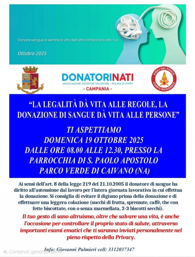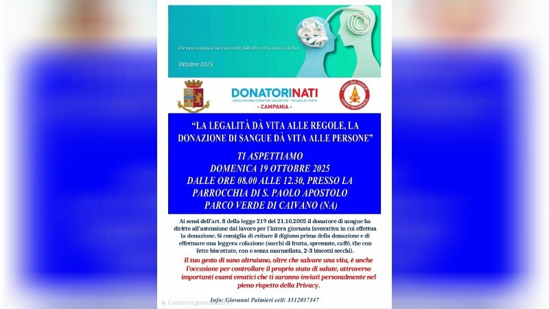 Domenica 19 ottobre 2025, dalle ore 8.00 alle 12.30, presso la Parrocchia di San Paolo Apostolo nel Parco Verde di Caivano, sarà possibile donare il sangue a bordo dell’autoemoteca dell’AVIS. Ad accogliere i donatori ci saranno personale medico specializzato e i volontari dell’associazione DonatoriNati Polizia di Stato, pronti a guidare e supportare chi vorrà compiere questo gesto di solidarietà.