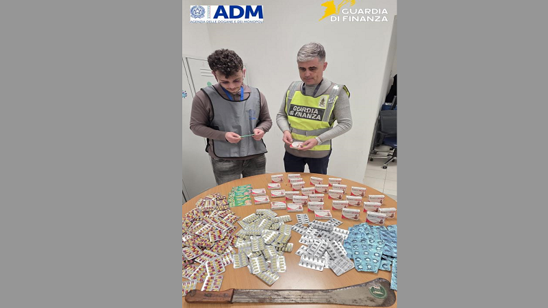 Nell’ambito delle costanti attività di prevenzione e repressione di traffici illeciti, i finanzieri della Compagnia di Capodichino e i funzionari dell’Agenzia delle Dogane e dei Monopoli - Distaccamento Locale Aeroporto di Napoli hanno sorpreso un cittadino ghanese, rientrante dal proprio paese di origine, con al seguito un machete con lama di 50 cm, oltre 2.000 compresse di medicinali in assenza di prescrizione medica, nonché oltre 80 kg. di prodotti vegetali sprovvisti di certificazione fitosanitaria e pericolosi per le colture nazionali.