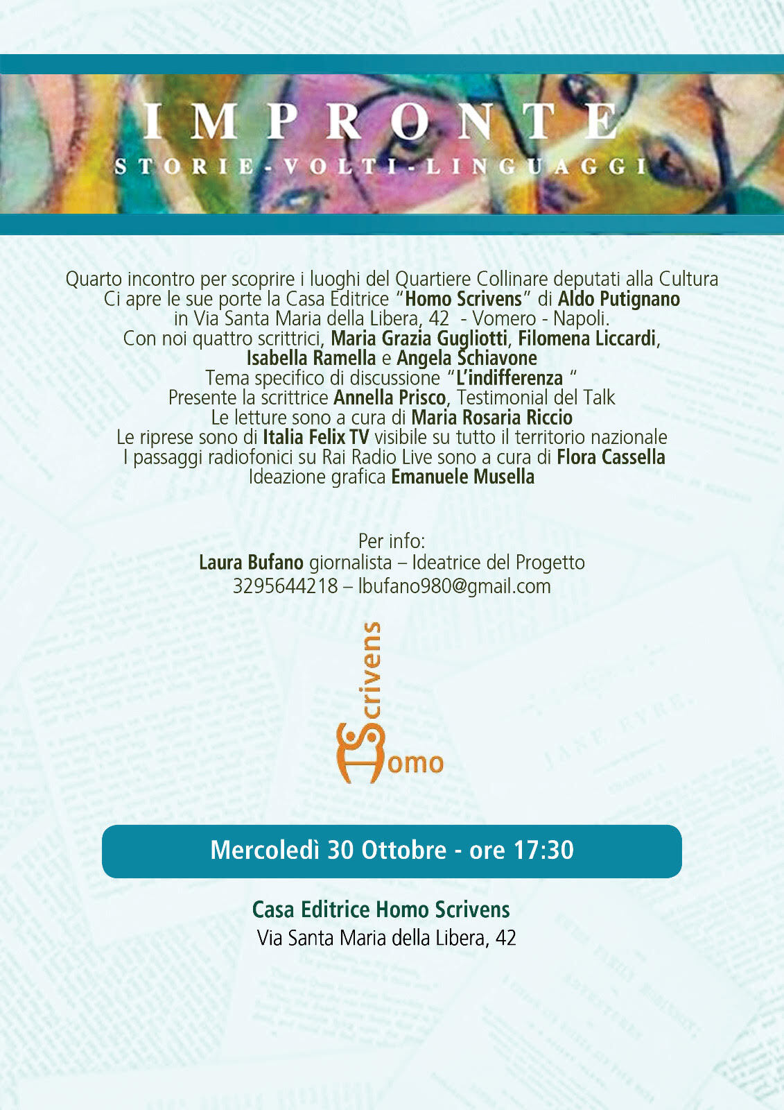 Riprendono gli incontri di “Impronte” Storie Volti Linguaggi per far conoscere i luoghi deputati alla Cultura del Quartiere Collinare e per far cadere il pregiudizio del Vomero come solo luogo di Pub, Ristoranti, Bar, Pizzerie … Il Talk è itinerante, dopo essere stati alla biblio – mediateca “Ethos e Nomos”, al Chiostro San Francesco, alla Fondazione Humaniter, per il prossimo incontro vi mostreremo una Casa Editrice vomerese. Mercoledì 30 ottobre saremo presso “Homo Scrivens”.
