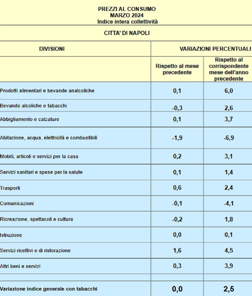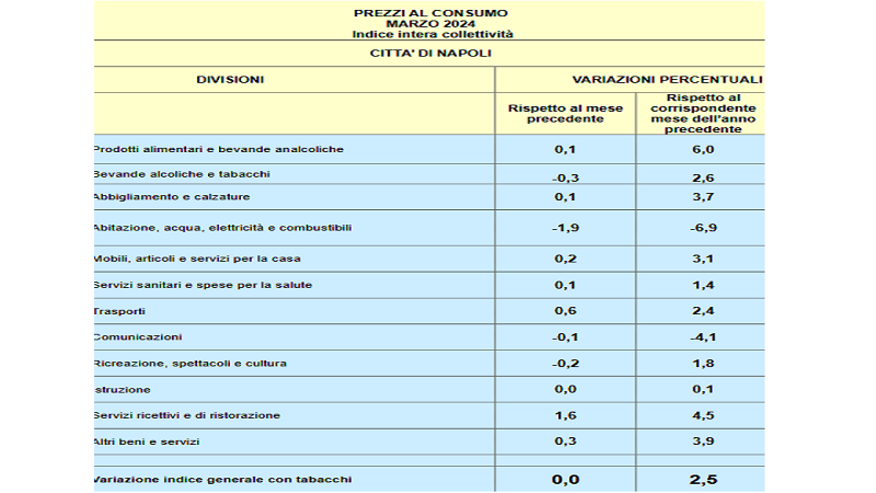 Nel mese di marzo 2024 la variazione dell'indice mensile dei prezzi al consumo (NIC) è pari allo 0,0. Il tasso tendenziale (2,5) è in lieve aumento rispetto al mese di febbraio 2024 (1,7). Si evidenziano di seguito le variazioni più rilevanti delle categorie delle sottoclassi di prodotto all'interno delle 12 divisioni.