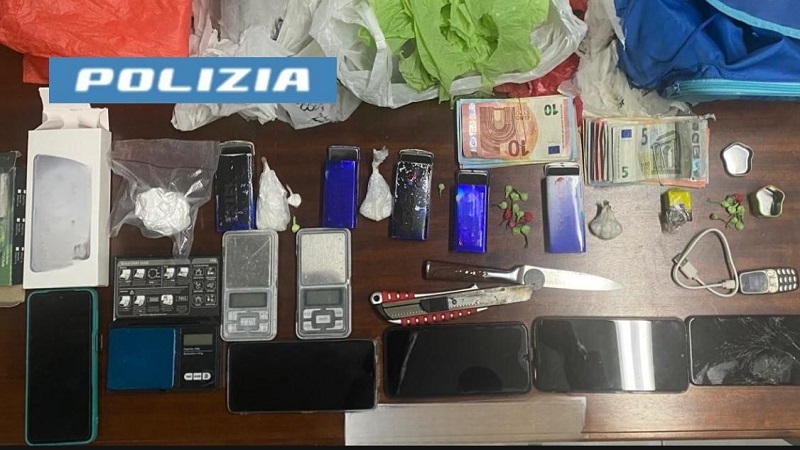 I poliziotti, tempestivamente intervenuti, hanno raggiunto il 34enne trovandolo in possesso di 1.290 euro, suddivisi in banconote di diverso taglio mentre, ben occultati nel retro di un congelatore posto nell’atrio, gli operatori hanno rinvenuto uno zaino in cui vi erano 2 contenitori in metallo contenenti cocaina, 14 involucri già confezionati della stessa sostanza, 6 telefoni cellulari, un coltello con lama di 20 centimetri, un taglierino con lama intrisa di sostanza stupefacente, 3 bilancini di precisione e diverso materiale per il confezionamento della droga.