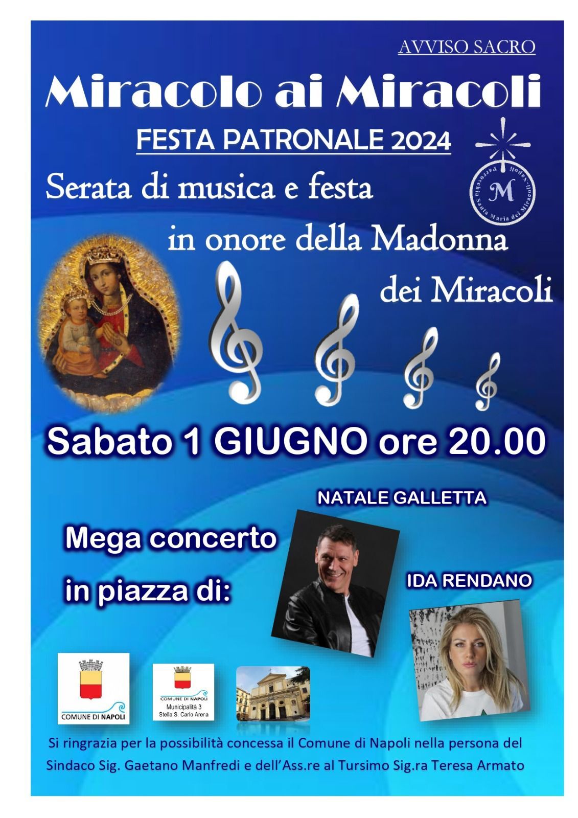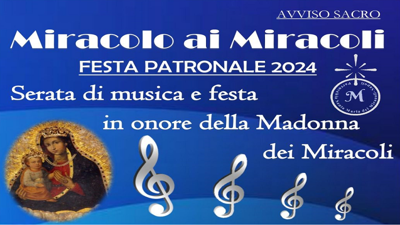Si terrà oggi a partire dalle ore 20 la serata di musica e festa in onore della Madonna dei Miracoli con il Patrocinio del Comune di Napoli e della 3° Municipalità - Stella San Carlo.