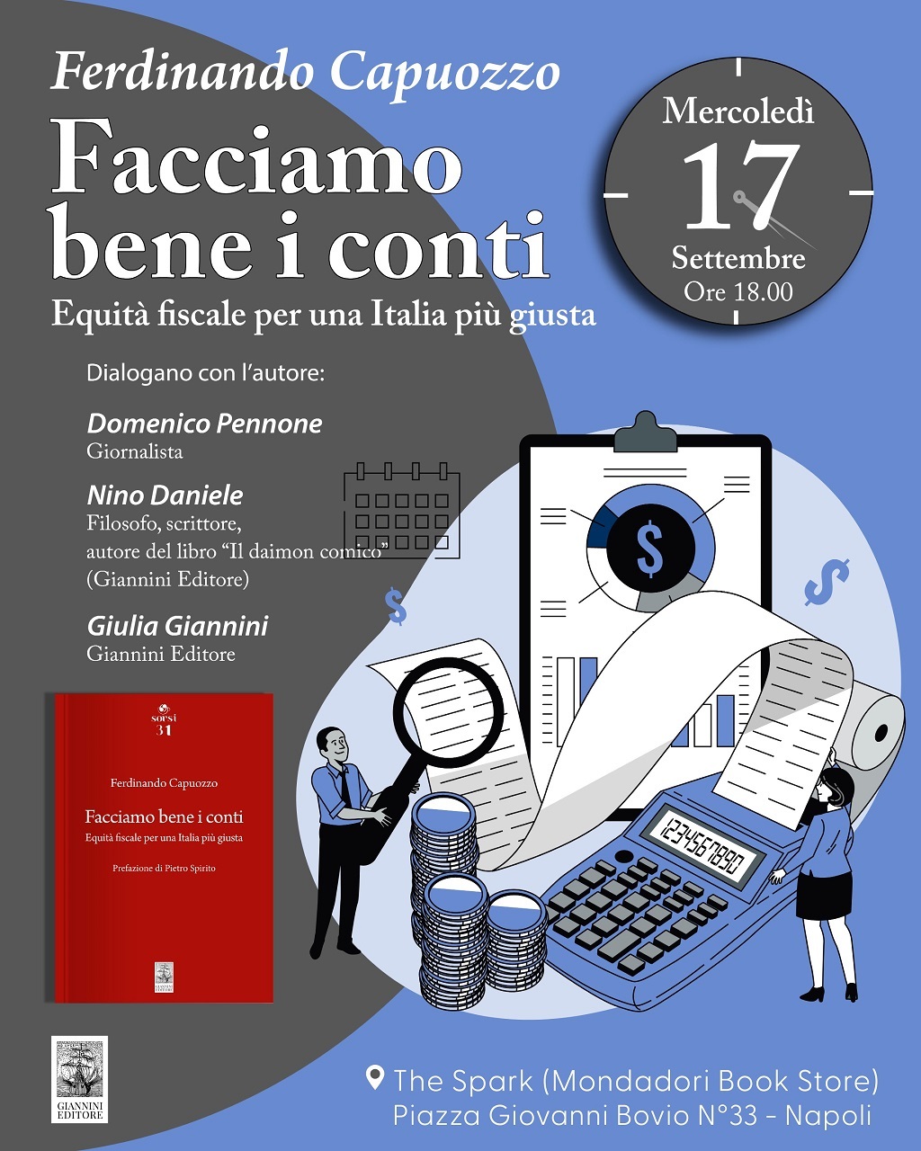 Sarà presentato presso la libreria The Spark di piazza Giovanni Bovio di Napoli, il libro di Ferdinando Capuozzo: “Facciamo bene i conti”, saggio economico pubblicato dalla Giannini Editore nella collana Sorsi. L’appuntamento è fissato per mercoledì 17 settembre alle ore 18. Dialogheranno con l’autore: Giulia Giannini della Giannini Editore, il giornalista Domenico Pennone, il filosofo e scrittore Nino Daniele autore del libro “Il daimon comico” (Giannini Editore).