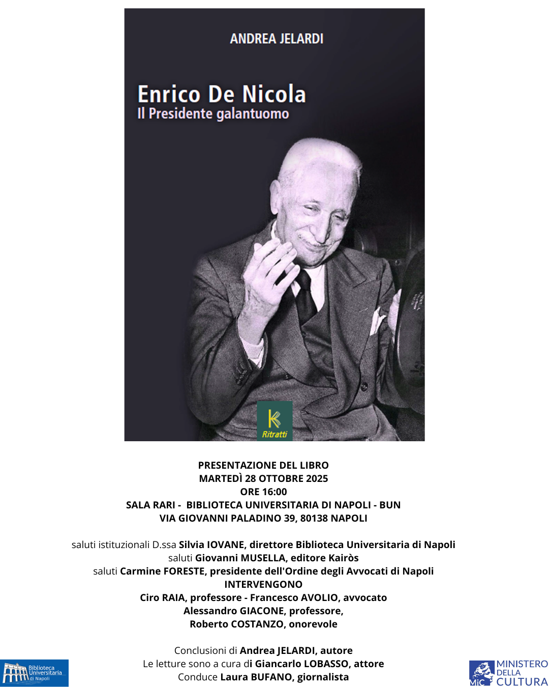 Per la commemorazione  del 65° anno dalla morte di Enrico De Nicola, avvenuta il 1 ottobre 1959, Martedì 28 ottobre 2025, presso la Sala Rari della Biblioteca Universitaria, via Giovanni Paladino, 39 – Napoli, ci sarà la presentazione dell’opera “Enrico De Nicola” Il Presidente galantuomo. di Andrea Jelardi – Kairos Edizioni.