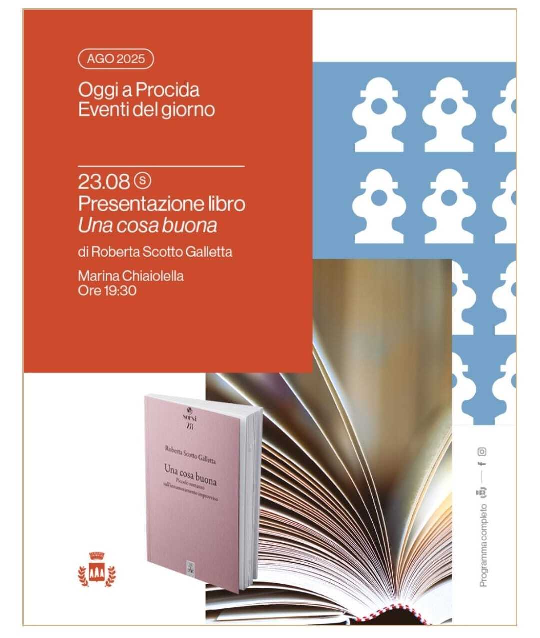 Evento da non perdere con Roberta Scotto Galletta, che presenterà a Procida presso la Marina di Chiaiolella il suo ultimo libro “Una cosa buona”. L’appuntamento è fissato per sabato 23 agosto alle ore 19,30. Il libro è pubblicato dalla Giannini Editore nella nota collana Sorsi. Dialogano con l’autrice: l’assessore alla Cultura del Comune di Procida Michele Del Leccese, i filosofi Eliana De Sanctis e Marco Neri.