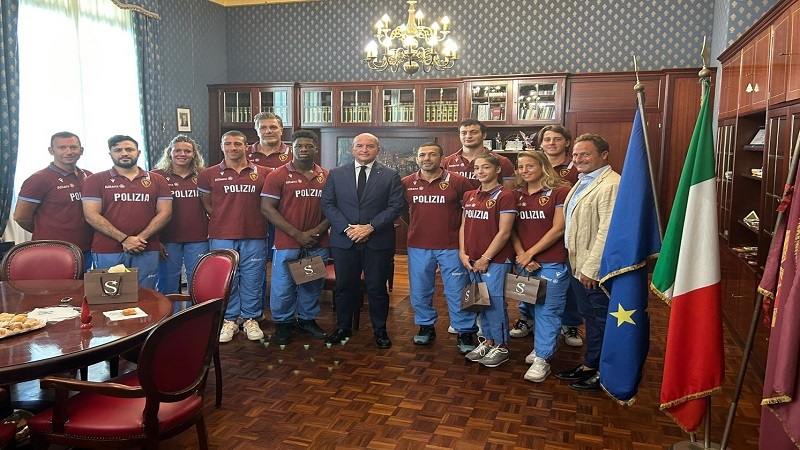 Ieri mattina, gli atleti delle Fiamme Oro Napoli, accompagnati dal Coordinatore del locale Centro Nazionale, Isp. Capo Luca Piscopo, dal Direttore Tecnico settore Judo V. Sov. Giuseppe Maddaloni e dai Tecnici Luigi Ganino settore Windsurfing e Beach Volley, Andrea Volpini settore Nuoto ed Enrico Parlati settore Judo e Ginnastica, hanno incontrato il Questore di Napoli, Dott. Maurizio Agricola, che, per l’occasione, ha donato loro una fiammella, realizzata a mano, che riporta il volto stilizzato della maschera di Pulcinella.