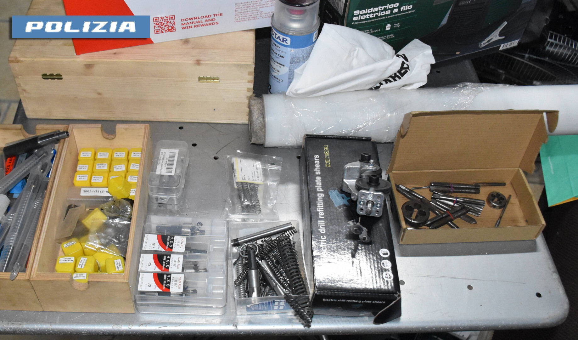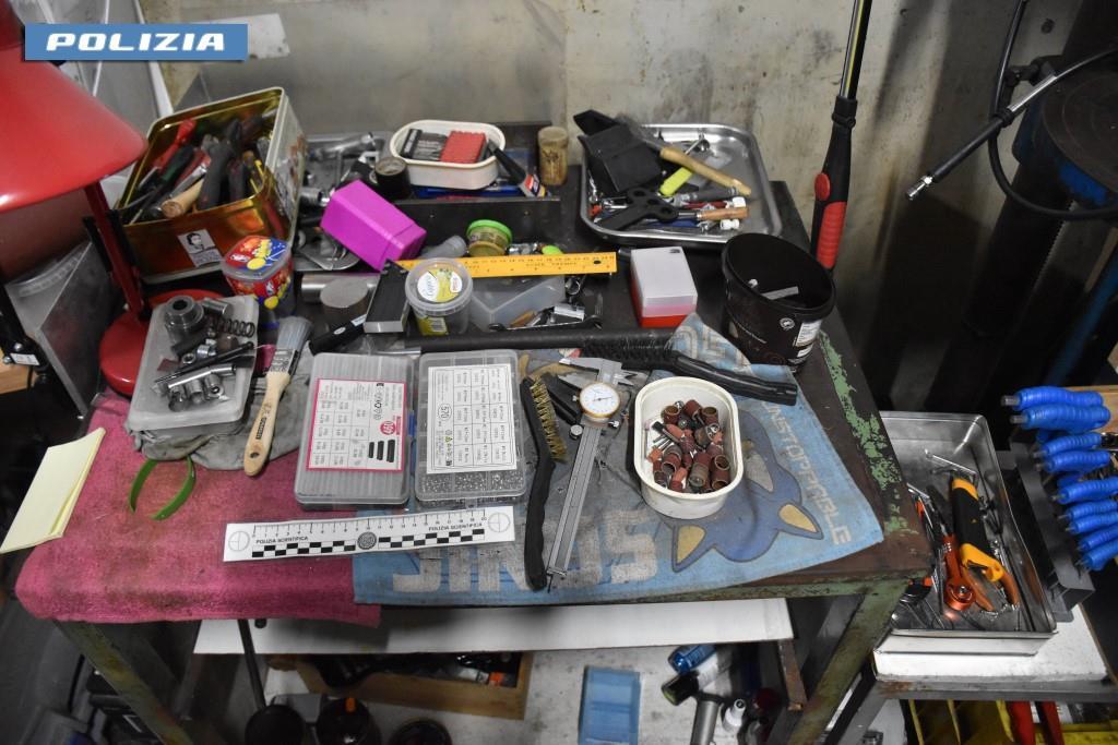 All’interno dello stesso sono stati rinvenuti e sequestrati torni, frese, prodotti chimici per la saldatura e la pulizia, strumenti per la manutenzione e preparazione delle armi da fuoco, un silenziatore, svariate canne di pistole, altre parti di armi utili all’impiego e un lampeggiante del tipo utilizzato dalle Forze dell’Ordine.