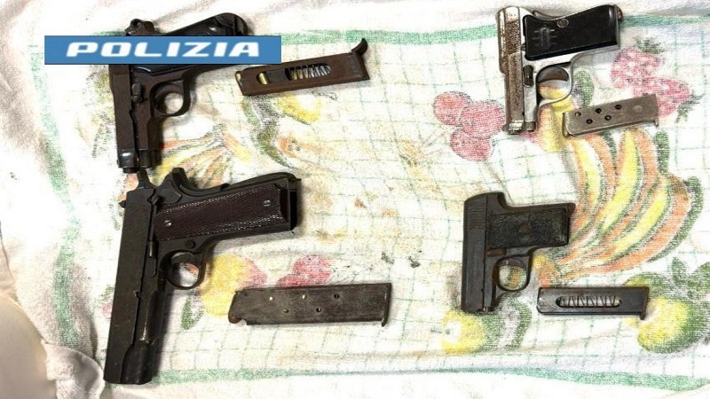 Difatti, i poliziotti hanno rinvenuto, ben occultate tra diverso materiale di risulta, quattro pistole ed in particolare, una Colt's 45, una Beretta 6.35, una Pistola Beretta 7.65 ed una Astra 7.65.