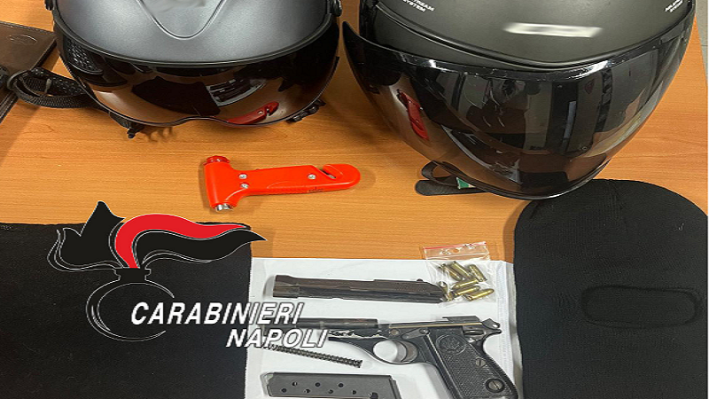 Nell’auto i Carabinieri trovano una pistola beretta calibro 7,65 con matricola abrasa e 7 proiettili. Rinvenuti e sequestrati anche due caschi integrali, due passamontagna ed un martelletto frangivetro.