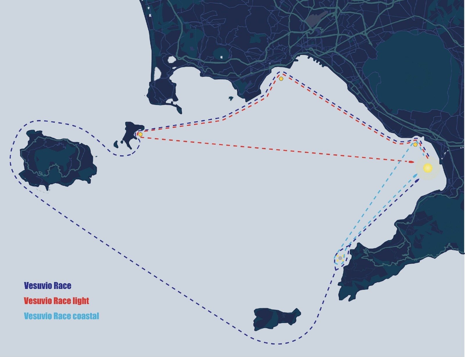 Vesuvio Race (75 miglia nautiche) con partenza dalla Baia dell’Oncino di Torre Annunziata, giro delle isole di Procida, Ischia e Capri, arrivo a Castellammare di Stabia doppiando la boa posta a Napoli all'altezza di Castel dell'Ovo visibile dal lungomare Caracciolo (Classi: Orc, X2, Class 950, Gran Crociera)