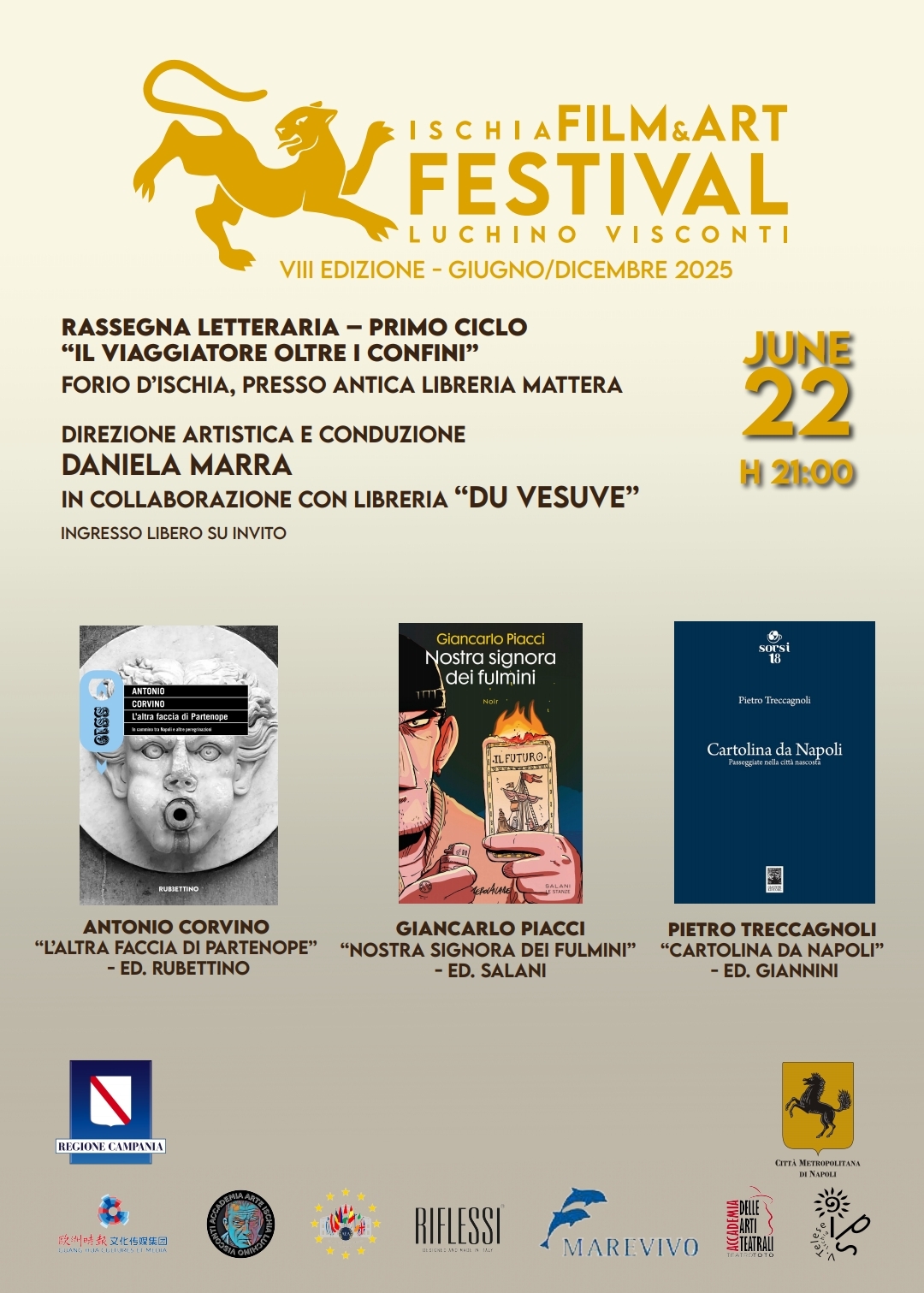 Forio d’Ischia. Importante partecipazione per il giornalista Pietro Treccagnoli che presenterà il suo libro: “Cartolina da Napoli. Passeggiate nella città nascosta durante l’ottava edizione dell’Ischia film & art festival Luchino Visconti, nell’ambito della rassegna letteraria “Il viaggiatore oltre i confini”. L’appuntamento è fissato per domenica 22 giugno alle ore 21 presso l’antica libreria Mattera, Forio d’Ischia. La direzione artistica e la conduzione dell’evento sono affidate alla giornalista Daniela Marra. Pubblicato dalla Giannini Editore, nella collana Sorsi, il libro di Treccagnoli è il volume numero 18 .