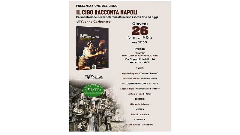 Yvonne Carbonaro nel suo libro “Il cibo racconta Napoli”, Kairos Edizioni, ricostruisce la storia della città di Napoli attraverso la sua cucina. Non è solo un libro di ricette, ma un saggio storico e culturale che mostra come il cibo sia collegato alla vita sociale, alle tradizioni e alla storia della città. L’autrice utilizza fonti storiche, testi letterari, leggende e tradizioni popolari per un percorso che parte dalle origini fino ai nostri giorni e dimostra come la cucina è una parte fondamentale della storia e della cultura di Napoli. Giovedì 26 marzo 2026, alle ore 17,30 ci sarà la presentazione del libro, presso “Buatta” Trattoria di conversazione, al Vomero in via Filippo Cifariello, 14. La trattoria di Angela Gargiulo rappresenta un piccolo grande presidio culturale gastronomico delle tipicità napoletane pertanto ben coerente con l’argomento della nostra autrice.