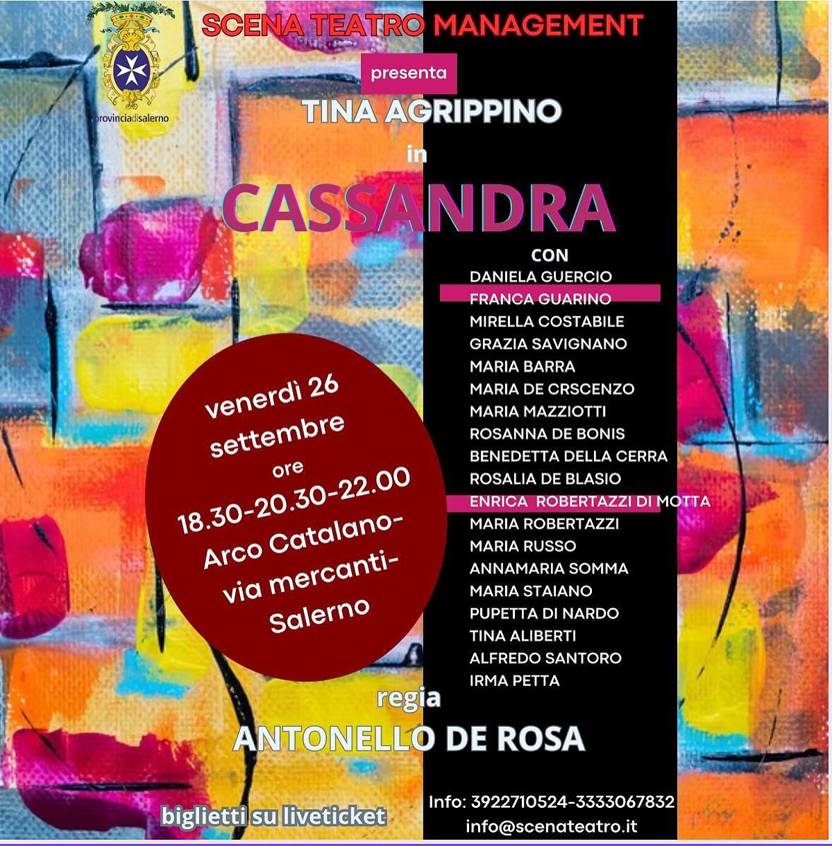 Ritorna il grande appuntamento annuale promosso dalla direzione artistica di Scena Teatro, con il teatro esperienziale: uno stage intensivo, 8 giorni, 30 ore, per costruire lo spettacolo “Cassandra. Visioni e Dolori” che debutterà il prossimo 26 settembre 2025 all’Arco Catalano di Salerno (via Mercanti 67, Palazzo Pinto), con il Patrocinio della Provincia di Salerno.