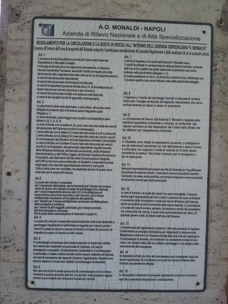 Napoli, 30/03/2014 - Accade a Napoli. Accade al Monaldi. E' domenica. L'orario di visita in alcuni reparti è dalle 14 alle 15. Al varco viene vietato l'ingresso con l'auto ai disabili in possesso del regolare contrassegno H. Si chiedono spiegazioni agli operatori. La risposta: "E' il regolamento" e viene indicata una tabella con il regolamento. All'art.3 vi è scritto: "l'ingresso ai disabili (si, è scritto proprio disabili e non come più appropriatamente diversamente abili o portatori di handicap) è consentito per il tempo strettamente necessario all'effettuazione della prestazione sanitaria". Quindi, se il "disabile" è in visita si deve arrangiare e parcheggiare fuori dall'ospedale. Poco importa se i posti dedicati ai diversamente abili all'interno del presidio, con tanto di palina H, siano tutti vuoti. Non si entra. Viene spontaneo domandarsi se si deve essere dei veri scienziati per occupare certi posti per poi partorire simili decisioni. Nel caso specifico con l'aggravante che dovrebbe trattarsi di personale altamente qualificato, pagato a spese dei contribuenti, migliaia e migliaia di euro al mese. Se poi ci si sofferma a pensare che stiamo parlando di una struttura sanitaria, solo il pensiero che si neghi l'accesso a chi ne ha diritto, per questioni di salute, fa inorridire. Come dovrebbe fare inoirridire gli organi competenti, in primo piano Assessorato alla Sanità e magistratura, la vicenda delle liste di attesa dell'Ospedale Monaldi dove più volte è stato denunciato che per ottenere una prestazione o si attende fino ad un anno o si paga e la si ottiene il giorno dopo.