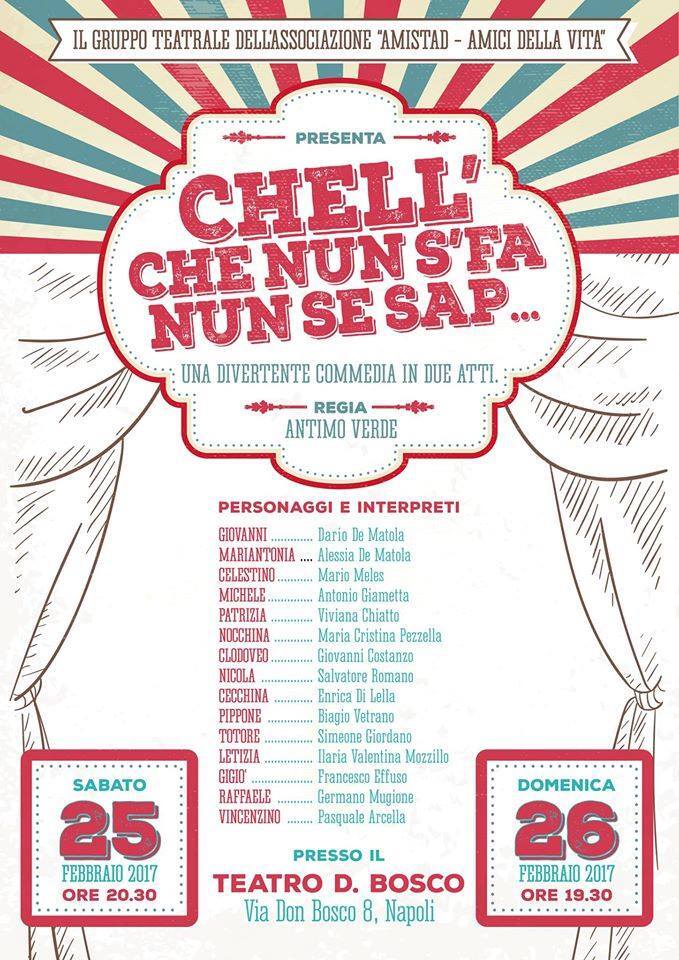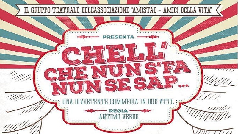 "Chell che nun se fa nun se sape" recita un antico proverbio napoletano, ed è proprio questo il titolo scelto dal regista Antimo Verde con la compagnia teatrale Amistad per mettere in scena la nuova commedia, riadattamento dell'opera "Scarpe doppie e cerevella fina" di Gaetano Di Maio. Attori giovani e giovanissimi, tutti rigorosamente napoletani, con tanta voglia di fare e mettersi in gioco, capaci di intrattenere e divertire il pubblico che si lascia coinvolgere dai protagonisti Giovanni (Dario De Matola), Maria Antonia (Alessia De Matola) e Celestino (Mario Meles) attraverso la storia: una madre, spinta dalla povertà, decide di affidare il proprio figlio ad una famiglia nobile e agiata, celando quindi la vera identità sua e del bambino, che viene riconosciuto e allevato come erede di un ricco proprietario terriero. La vicenda è un agglomerato di intrighi e segreti, dove però non mancano le risate e l'umorismo, come da tradizione del teatro partenopeo. «Dopo lunghi mesi di prove, siamo davvero felici di mettere in scena questa commedia alla quale abbiamo lavorato tutti duramente; abbiamo cercato di superare i nostri limiti e le nostre paure, affidando ruoli ad attori che nella vita reale sono l'opposto di ciò che recitano», ha dichiarato al termine dello spettacolo il regista, che ha poi concluso ringraziando il pubblico per la calorosa accoglienza ricevuta. La compagnia Amistad replicherà lo spettacolo stasera 26 febbraio alle ore 19.30 presso il teatro don Bosco, in via don Bosco 8 a Napoli.