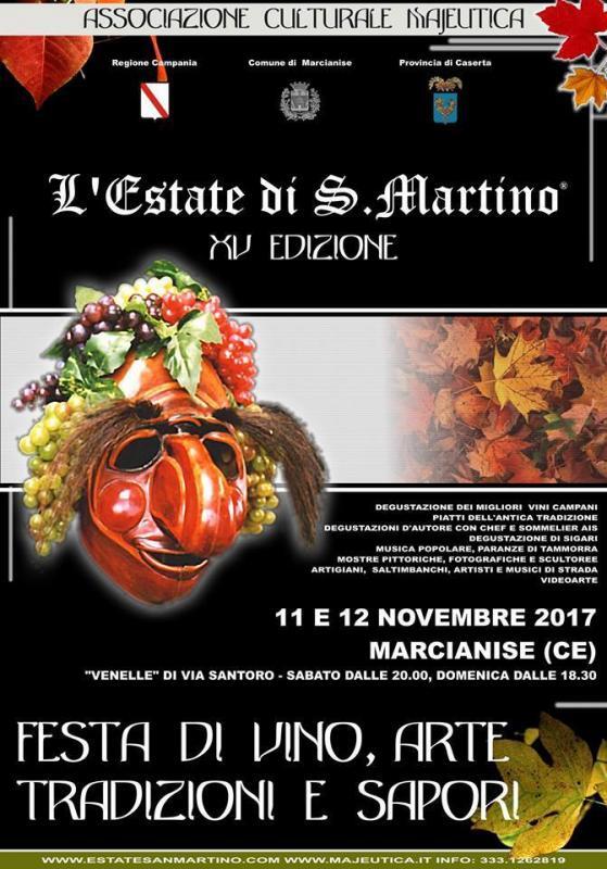 Festa di vino, arte, tradizioni e sapori. Migliaia di visitatori, frotte di avventori che magicamente si trasformano in danzatori e musici di strada, suoni e canti intonati in ogni angolo al lume delle torce, il tintinnare continuo dei brindisi, personaggi fiabeschi che sbucano dagli anfratti bui dei vicoli, il sorriso di centinaia di bambini increduli, i profumi e i sapori di una cucina senza tempo, in una parola: magia! E' questa l'Estate di San Martino che si svolgerà anche quest'anno a Marcianise, è la XV edizione, sabato 11 e domenica 12 novembre. Un tripudio di danze e musica popolare che da sempre affascina e coinvolge chi si imbatte nel dedalo di San Martino. Il vino è complice, il buon cibo pure, e ciascuno si ritrova a cantare, a danzare, a battere le mani al tempo delle tammurriate. Un’atmosfera insolita che ancora una volta trascina lo storico quartiere delle venelle in una dimensione onirica e magica. Lungo il percorso poi, mostre fotografiche, esperienze d’arte attiva, animazione per i più piccoli, installazioni di arte floreale. E ancora pittura, scultura, l’artigianato locale che riempie i vicoli di colori e sorprese. Per i buongustai alla ricerca di sapori dimenticati ci saranno le pettole e fagioli alla maniera di Marcianise, i mazzuoccoli, l’antichissima insalata di piere e musso con le olive e i peperoni, il baccalà fritto, il caciocavallo impiccato, la brace, i contorni della tradizione. Per i palati più curiosi la sede di Majeutica ospiterà ancora una volta la degustazione di piatti gourmet e di etichette scelte, in un percorso guidato da Sommelier professionisti. E come per ogni anno, anche la quindicesima edizione de L’Estate sarà l’occasione per conoscere l’impegno civile di Marcianise, da anni riconosciuta come terra di associazioni.