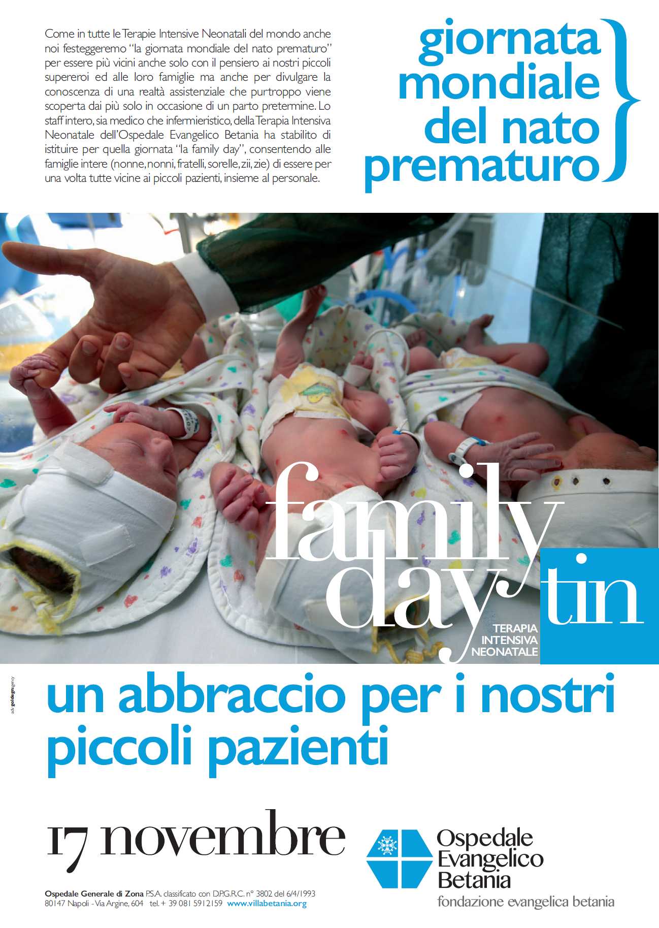 Nei mesi scorsi nell’Ospedale Evangelico Betania è nato un bambino di appena 470 grammi per un gravissimo ritardo di crescita intrauterino a solo 27 settimane di gestazione che grazie alle cure ricevute in Terapia Intensiva Neonatale (TIN) oggi sta per lasciare il reparto con una ottima prognosi futura. Ma il “piccolo pulcino”, come piace chiamare i prematuri al team dell’ospedale, è solo uno degli oltre 500 casi trattati ogni anno dall’Unità Operativa Complessa di Neonatologia, TIN e Patologia neonatale. Per sensibilizzare i genitori “in attesa” e le coppie che già vivono questo distacco precoce, anche quest’anno, l’Ospedale di Ponticelli in occasione della Giornata mondiale della prematurità, promuove il Family Day, l’iniziativa che apre per un giorno le porte della TIN anche agli altri familiari. E così il 17 novembre i piccoli pulcini della Terapia Intensiva Neonatale potranno conoscere i loro fratellini e sorelline, i nonni e gli zii. Come nel caso del piccolo Gerardo che conoscerà meglio il fratellino ed i nonni che in questi 4 mesi hanno fatto il tifo per lui. Sarà concesso un tempo di trenta minuti a nucleo familiare. Nonne, zii e fratelli e sorelle saranno aiutati a prendere confidenza con i loro piccoli da medici e infermieri della Unità Operativa Complessa di Neonatologia e TIN dell’Ospedale.