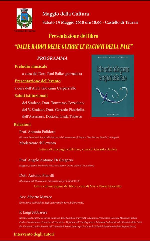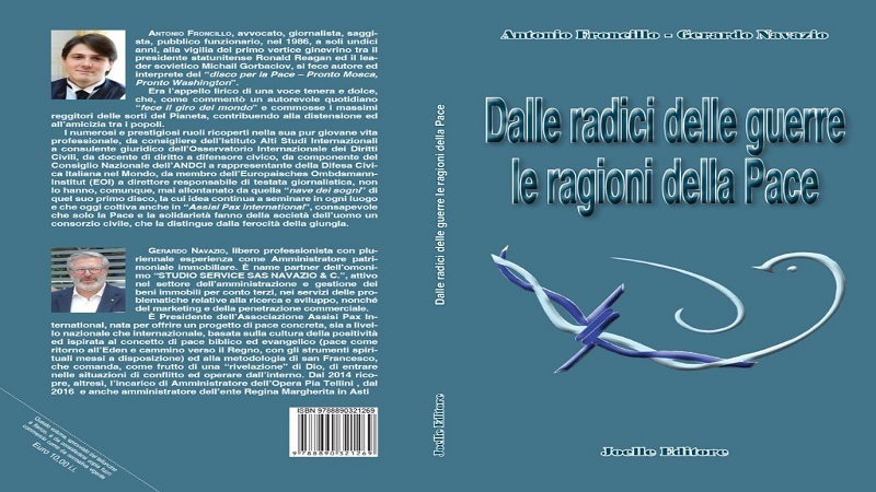 Presentazione nel Castello di Taurasi sabato 19 maggio alle ore 18 del libro "Dalle radici della guerre le ragioni della pace", Joelle Editore. Gli autori: Antonio Froncillo, avvocato, giornalista, funzionario della sanità pubblica, già autore di numerosi saggi che hanno raccolto anche autorevoli consensi di capi di Stato e di governo, fin da giovanissimo si è sentito impegnato a condannare l’irrazionalità e la bestialità della guerra. Molti ricorderanno che, già all’età di dieci anni, in occasione del primo vertice ginevrino tra l’allora presidente degli Stati Uniti d’America Ronald Reagan ed il leader sovietico Mikhail Gorbachev, si fece autore ed interprete di quel suggestivo “disco per la pace”, che, come scrisse un noto quotidiano “fece il giro del mondo”, commuovendo i reggitori delle sorti del pianeta. Gerardo Navazio, libero professionista con pluriennale esperienza come Amministratore patrimoniale immobiliare, nonché Amministratore dell’Opera Pia Tellini e dell’Ente Regina Margherita di Asti, è presidente della benemerita “Assisi Pax International”, che, ispirata alla metodologia di San Francesco, tanto efficacemente opera per il dialogo interreligioso e fra le nazioni. Il lavoro da essi prodotto a quattro mani ripercorre millenni di storia, esaminando minuziosamente le cause e le disastrose conseguenze delle guerre, che hanno segnato dolorosamente il cammino dell’uomo verso la consapevolezza, ancora non penetrata nella mente di tutti, dell’inciviltà delle stesse. E' una profonda analisi di matrice storica, sociologica e psicologica sulle cause delle guerre, sia di matrice interumana o interstatale.
