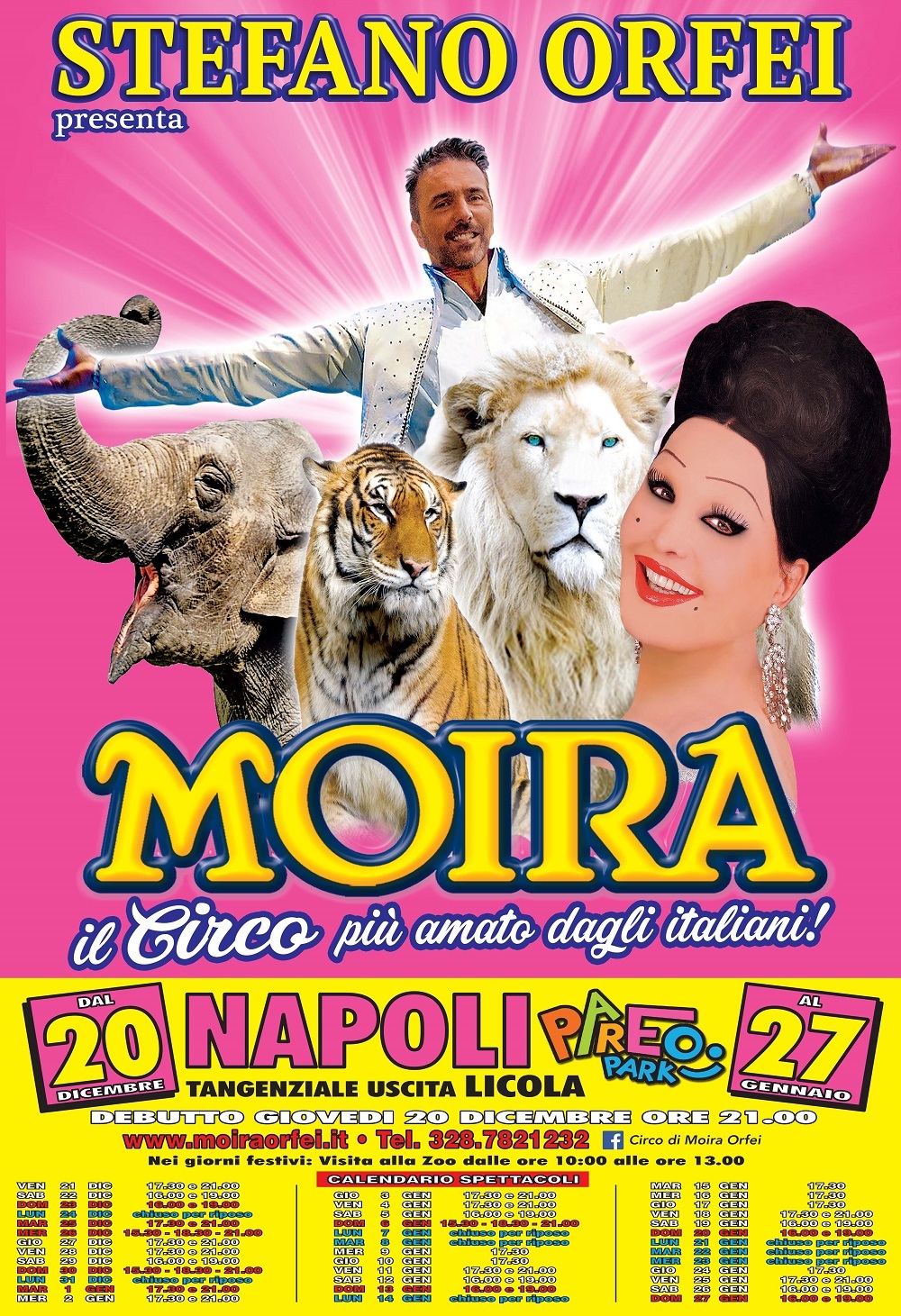 Il Circo Tradizionale di Moira Orfei arriva al Pareo Park per le festività natalizie. L’overture del nuovo spettacolo, che sarà presentato per la prima volta a Napoli, sarà all’insegna della solidarietà: giovedì 20 dicembre, in occasione del debutto napoletano del Circo, saranno ospitate 350 persone appartenenti a famiglie meno abbienti (individuate in accordo con la Diocesi di Napoli e la Provincia) che altrimenti non avrebbero potuto assistere al novo straordinario show. Faranno parte del pubblico anche 250 bambini, individuati dall’Esercito Italiano, i cui genitori sono attualmente impegnati in missioni all’estero.