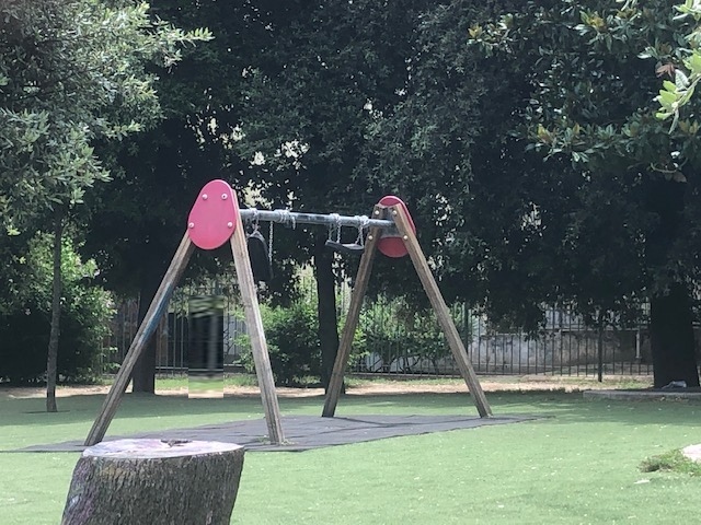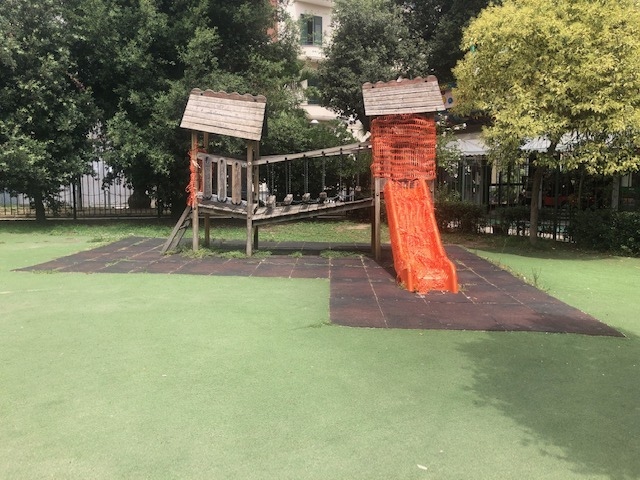"In pessime condizioni versa, tra gli altri, il prato, che si trova nei pressi dell'ingresso su via Pacio Bertini, dove fu collocata l’opera d'arte in bronzo: “Pulcinella il dubbio dell’uovo”, realizzata nel 1996 dal maestro Lello Esposito. La scultura, ad altezza di bambino, originariamente aveva due manine che però nottetempo furono rubate, lasciando una cavità che l'autore decise di riempire con un cuore. Oggi, dopo un quarto di secolo, l'area dove resta la scultura, a pochi passi della quale si trovava anche il roseto, nel frattempo scomparso, con targa, quest'ultima quasi del tutto illeggibile e nascosta, dedicato a Sergio De Simone, l’unico bambino italiano dei 20 che furono uccisi nella scuola di Bullenhuser Damm, nato a Napoli, nel quartiere Vomero, appare in stato di totale abbandono, a ragione dell'assenza della necessaria manutenzione".