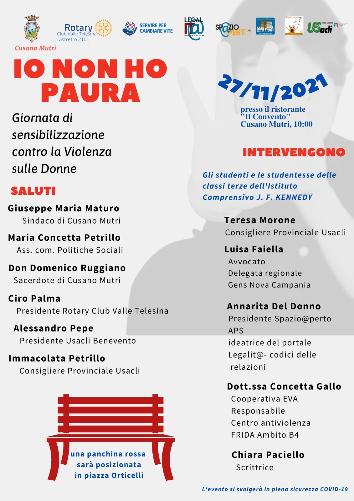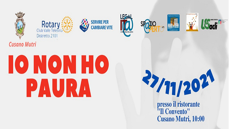 Il prossimo 27 novembre alle ore 10,00 si terrà presso la splendida cornice del ristorante “Il Convento” di Cusano Mutri il convegno dal titolo “Io non ho paura – Giornata di sensibilizzazione contro la violenza sulle donne” organizzato dal consigliere provinciale USacli Immacolata Petrillo in collaborazione con il Rotary Club Valle Telesina e con il patrocinio del comune di Cusano Mutri.