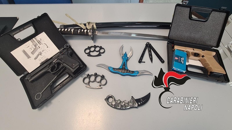 I Carabinieri della stazione di Casavatore hanno immediatamente avviato le indagini e, attraverso la visione delle immagini di video sorveglianza registrate in strada, identificato il giovanissimo. Hanno bussato alla porta della sua abitazione e trovato un coltello a serramanico, uno a farfalla e uno multilama. Poi due pistole giocattolo e una katana.