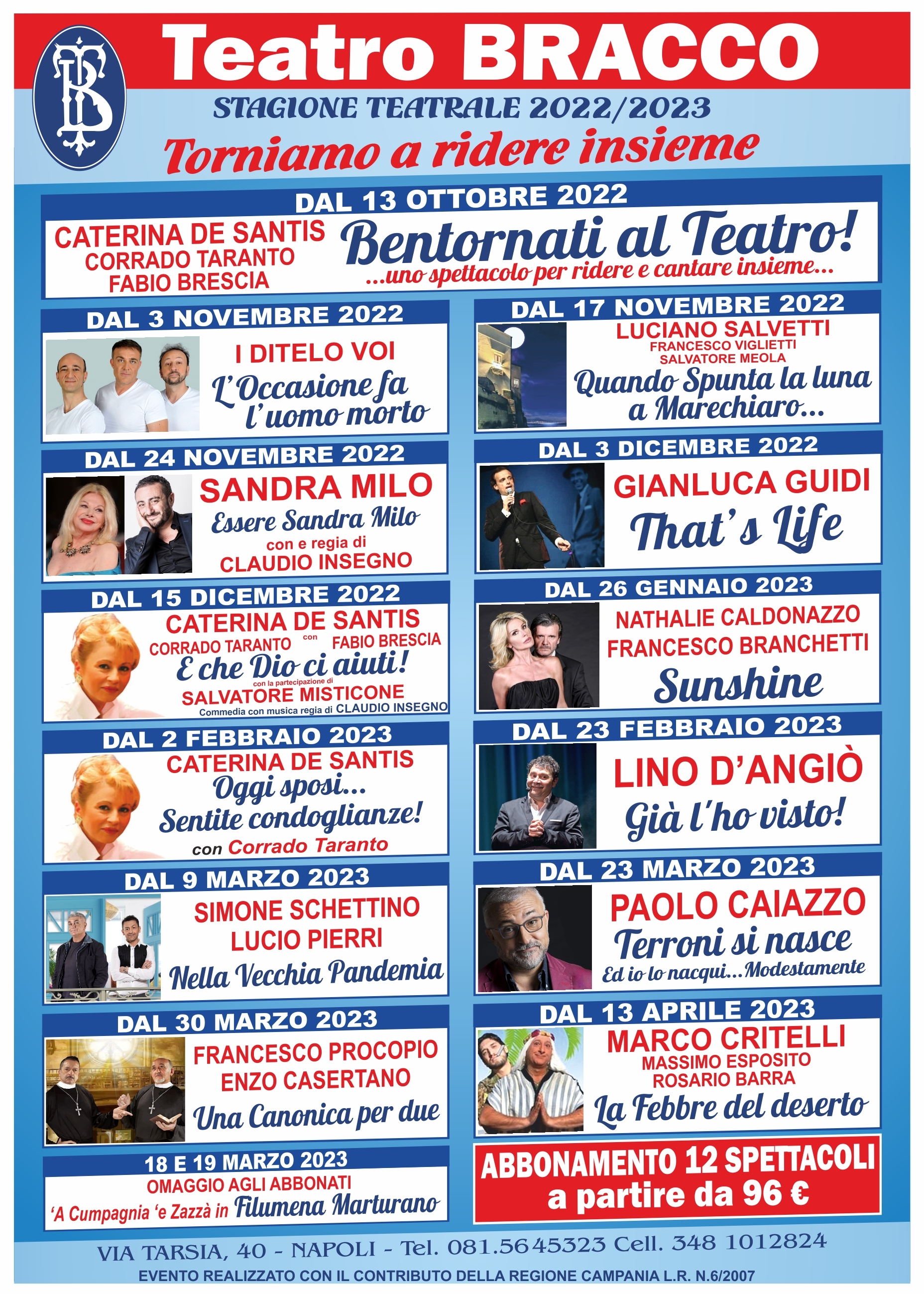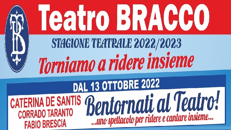 Il teatro della tradizione napoletana riabbraccia il suo affezionato pubblico attraverso una lunga cavalcata che, da ottobre 2022 ad aprile 2023, vedrà protagonista la Compagnia Stabile del Bracco, guidata dalla direttrice artistica ed attrice Caterina De Santis, di un divertente, fantasioso, esaltante viaggio nel repertorio comico partenopeo, nella canzone classica e tra le ultime tendenze del teatro italiano. "La parola d'ordine è sempre leggerezza ma senza perdere l'occasione per riflettere su questi anni di pandemia e di sofferenza, che tanto ci hanno insegnato e che repentinamente hanno rivoluzionato tutte le nostre abitudini, i rapporti di coppia e quelli nella società. Insomma, l'approccio alla vita. Perché come diceva il grande e compianto maestro Gigi Proietti: Benvenuti a teatro, dove tutto è finto ma niente è falso. E noi questo lo sappiamo e lo ricordiamo sempre prima di andare in scena", sottolinea la De Santis, che quest'anno firma con Corrado Taranto e Fabio Brescia, perni della Compagnia stabile da lei capitanata, un testo totalmente inedito e dal titolo emblematico, "Bentornati al Teatro", che vuole essere un inno alla ripartenza e alla ripresa delle attività in un clima di normalità e rilassatezza.
