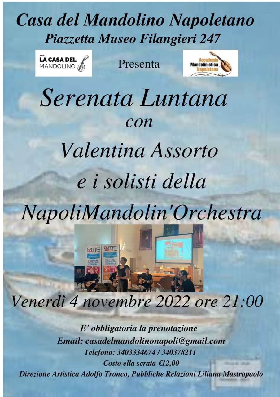 Una serata d’eccezione con la voce di Valentina Assorto accompagnata dai Solisti della NapoliMandolin 'Orchestra che si esibiranno in un concerto dedicato alla canzone classica napoletana per ricordare le più belle "Serenate" del repertorio classico napoletano.