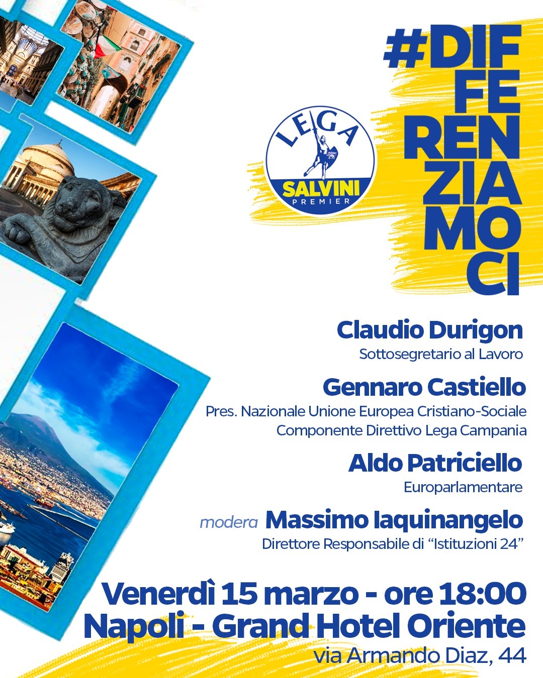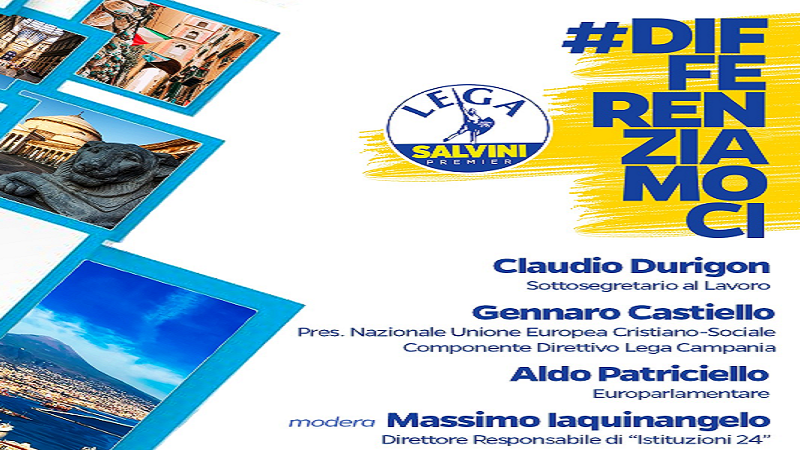 Domani, venerdì 15 marzo, ore 18:00, parte il nuovo format "#differenziamoci" ideato e coordinato da Gennaro Castiello e sostenuto dalla Lega Campania. Uno spazio di confronto sui temi legati alla regione Campania e all'Europa. Al via il primo incontro che avrà come tema la "Sanità pubblica e privata: opportunità di rilancio" presso l'Hotel Oriente in via A. Diaz 44, Napoli, partecipano, oltre all'autore, il commissario regionale della Lega Claudio Durigon e l'eurodeputato, Aldo Patriciello. Modera il giornalista Massimo Iaquinangelo.