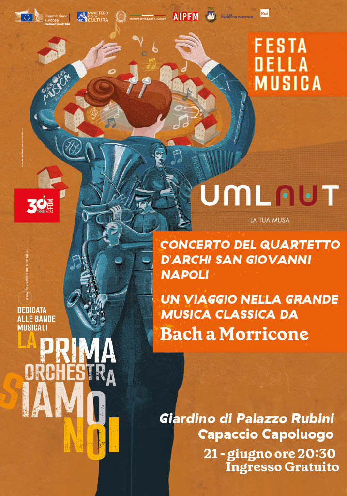 L’iniziativa nasce dalla collaborazione tra Umlaut - La Tua Musa APS e il Comune di Capaccio Paestum e rientra nel circuito nazionale coordinato da AIPFM e Ministero della Cultura della Festa della Musica 2024 “La prima orchestra siamo noi”.