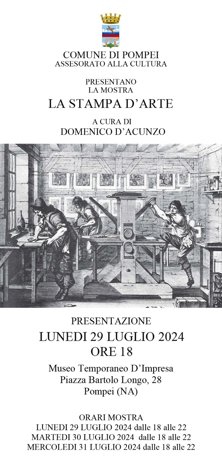 Il Museo Temporaneo d’Impresa ospiterà "La Stampa D’Arte – la mostra", organizzata dall’Assessorato alla Cultura del Comune di Pompei nell’ambito delle iniziative a sfondo culturale proposte in linea con la candidatura a “Capitale della Cultura 2027” e curata dal prof. Domenico D’Acunzo, appassionato collezionista di stampe d’arte e bronzi della scuola napoletana. L’inaugurazione avrà luogo lunedì 29 luglio alle ore 18 e la mostra proseguirà fino al 31 luglio, a ingresso libero dalle ore 18 alle 22.