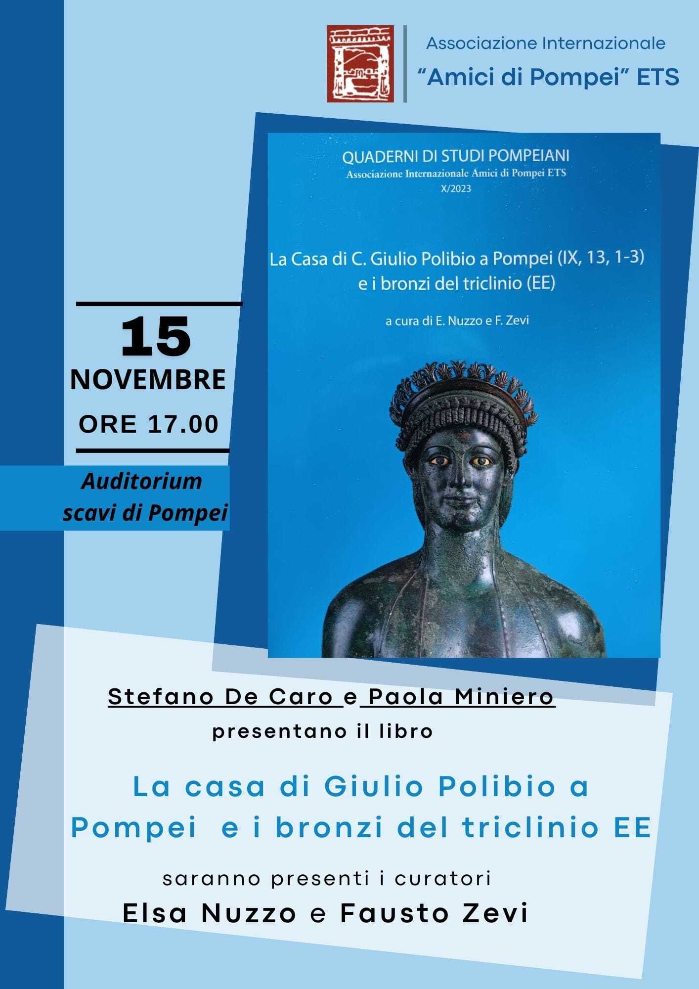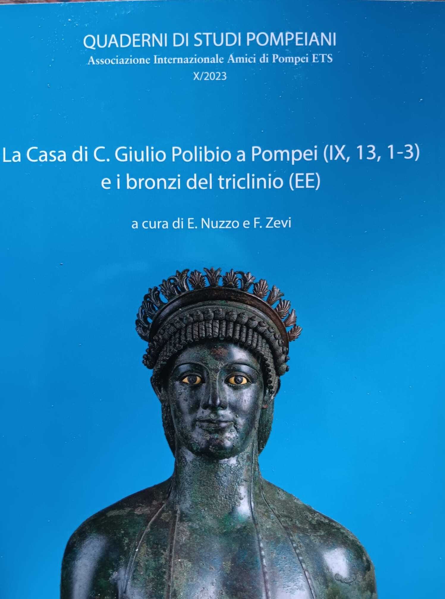 Venerdì 15 novembre, alle ore 17, nell’Auditorium degli Scavi di Pompei l’Associazione Internazionale “Amici di Pompei” ETS presenterà il decimo volume della collana da essa edita dei “Quaderni di Studi Pompeiani”, “La Casa di C. Giulio Polibio a Pompei (IX, 13, 1-3) e i bronzi del triclinio (EE)”. Curato dagli archeologi Fausto Zevi ed Elsa Nuzzo, presenti alla serata, verrà presentato dagli archeologi Stefano De Caro e Paola Miniero.