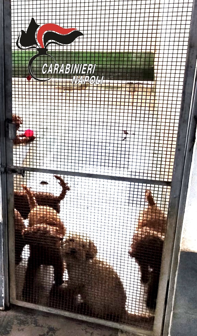 I Carabinieri ne hanno trovati 26, in un canile costruito abusivamente sul solaio di un palazzo di Villaricca. Non parliamo di una struttura improvvisata, di qualche palo di legno e di una tettoia, ma di un complesso in muratura di gabbie recintate dotate in alcuni casi anche di lampade riscaldanti per i cuccioli neonati.
